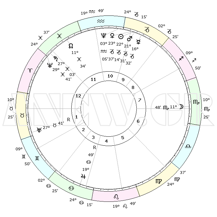 | | ΘΕΣΕΙΣ ΠΛΑΝΗΤΩΝ ΑΣΤΡΟΛΟΓΙΚΟΥ ΧΑΡΤΗ ΤΗΣ ΣΤΙΓΜΗΣ ΑΥΤΗΣ | | | | Πλανήτης | Ζώδιο | Μοίρες | Δεκαήμ. | Σε οίκο | Απόκλιση | | Ακμές των οίκων | | Ηλιος | Αιγόκερως | 22°10' | Τρίτο | 11 | 21 S 37 | | 1ος | 28°30' | Ιχθείς | | Σελήνη | Σκορπιός | 10°55' | Δεύτερο | 8 | 19 S 20 | | 2ος | 09°09' | Ταύρος | | Ερμής | Αιγόκερως | 16°25' | Δεύτερο | 10 | 24 S 02 | | 3ος | 06°47' | Δίδυμοι | | Αφροδίτη | Αιγόκερως | 23°31' | Τρίτο | 11 | 22 S 16 | | 4ος | 29°09' | Δίδυμοι | | Αρης | Αιγόκερως | 21°27' | Τρίτο | 11 | 22 S 40 | | 5ος | 21°24' | Καρκίνος | | Δίας | Καρκίνος | 19°50'R | Δεύτερο | 4 | 22 N 14 | | 6ος | 18°34' | Λέων | | Κρόνος | Ιχθείς | 27°03' | Τρίτο | 12 | 03 S 13 | | 7ος | 28°30' | Παρθένος | | Ουρανός | Ταύρος | 27°41'R | Τρίτο | 2 | 19 N 27 | | 8ος | 09°09' | Σκορπιός | | Ποσειδώνας | Ιχθείς | 29°41' | Τρίτο | 1 | 01 S 20 | | 9ος | 06°47' | Τοξότης | | Πλούτωνας | Υδροχόος | 03°04' | Πρώτο | 11 | 23 S 09 | | 10ος | 29°09' | Τοξότης | | Β. Δεσμός | Ιχθείς | 11°34' | Δεύτερο | 12 | 07 S 13 | | 11ος | 21°24' | Αιγόκερως | | Ωροσκόπος | Ιχθείς | 28°30' | Τρίτο | | | 12ος | 18°34' | Υδροχόος | | Μεσουράνημα | Τοξότης | 29°09' | Τρίτο | | | |