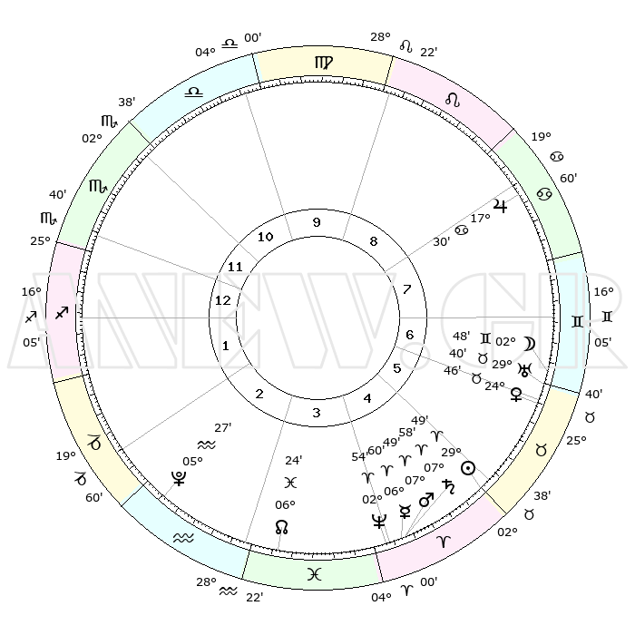| | ΘΕΣΕΙΣ ΠΛΑΝΗΤΩΝ ΑΣΤΡΟΛΟΓΙΚΟΥ ΧΑΡΤΗ ΤΗΣ ΣΤΙΓΜΗΣ ΑΥΤΗΣ | | | | Πλανήτης | Ζώδιο | Μοίρες | Δεκαήμ. | Σε οίκο | Απόκλιση | | Ακμές των οίκων | | Ηλιος | Κριός | 29°45' | Τρίτο | 5 | 11 N 23 | | 1ος | 27°41' | Σκορπιός | | Σελήνη | Δίδυμοι | 01°52' | Πρώτο | 7 | 25 N 30 | | 2ος | 28°31' | Τοξότης | | Ερμής | Κριός | 06°54' | Πρώτο | 4 | 00 N 20 | | 3ος | 03°50' | Υδροχόος | | Αφροδίτη | Ταύρος | 24°42' | Τρίτο | 6 | 19 N 19 | | 4ος | 09°49' | Ιχθείς | | Αρης | Κριός | 07°46' | Πρώτο | 4 | 02 N 12 | | 5ος | 11°08' | Κριός | | Δίας | Καρκίνος | 17°29' | Δεύτερο | 8 | 22 N 40 | | 6ος | 06°30' | Ταύρος | | Κρόνος | Κριός | 07°58' | Πρώτο | 4 | 01 N 11 | | 7ος | 27°41' | Ταύρος | | Ουρανός | Ταύρος | 29°40' | Τρίτο | 7 | 19 N 55 | | 8ος | 28°31' | Δίδυμοι | | Ποσειδώνας | Κριός | 02°54' | Πρώτο | 4 | 00 S 03 | | 9ος | 03°50' | Λέων | | Πλούτωνας | Υδροχόος | 05°27' | Πρώτο | 3 | 22 S 48 | | 10ος | 09°49' | Παρθένος | | Β. Δεσμός | Ιχθείς | 06°24' | Πρώτο | 3 | 09 S 09 | | 11ος | 11°08' | Ζυγός | | Ωροσκόπος | Σκορπιός | 27°41' | Τρίτο | | | 12ος | 06°30' | Σκορπιός | | Μεσουράνημα | Παρθένος | 09°49' | Πρώτο | | | |
