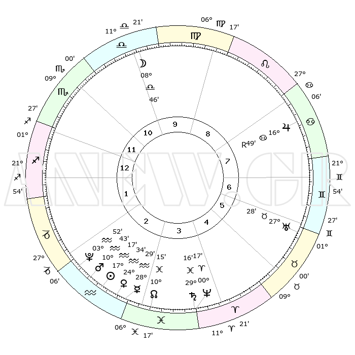 | | ΘΕΣΕΙΣ ΠΛΑΝΗΤΩΝ ΑΣΤΡΟΛΟΓΙΚΟΥ ΧΑΡΤΗ ΤΗΣ ΣΤΙΓΜΗΣ ΑΥΤΗΣ | | | | Πλανήτης | Ζώδιο | Μοίρες | Δεκαήμ. | Σε οίκο | Απόκλιση | | Ακμές των οίκων | | Ηλιος | Υδροχόος | 17°13' | Δεύτερο | 3 | 15 S 40 | | 1ος | 02°58' | Τοξότης | | Σελήνη | Ζυγός | 07°59' | Πρώτο | 10 | 05 S 30 | | 2ος | 04°32' | Αιγόκερως | | Ερμής | Υδροχόος | 28°23' | Τρίτο | 3 | 13 S 24 | | 3ος | 10°44' | Υδροχόος | | Αφροδίτη | Υδροχόος | 24°29' | Τρίτο | 3 | 14 S 42 | | 4ος | 16°49' | Ιχθείς | | Αρης | Υδροχόος | 10°40' | Δεύτερο | 2 | 18 S 34 | | 5ος | 17°28' | Κριός | | Δίας | Καρκίνος | 16°49'R | Δεύτερο | 8 | 22 N 41 | | 6ος | 12°07' | Ταύρος | | Κρόνος | Ιχθείς | 29°16' | Τρίτο | 4 | 02 S 17 | | 7ος | 02°58' | Δίδυμοι | | Ουρανός | Ταύρος | 27°28' | Τρίτο | 6 | 19 N 24 | | 8ος | 04°32' | Καρκίνος | | Ποσειδώνας | Κριός | 00°17' | Πρώτο | 4 | 01 S 05 | | 9ος | 10°44' | Λέων | | Πλούτωνας | Υδροχόος | 03°52' | Πρώτο | 2 | 23 S 00 | | 10ος | 16°49' | Παρθένος | | Β. Δεσμός | Ιχθείς | 10°16' | Δεύτερο | 3 | 07 S 43 | | 11ος | 17°28' | Ζυγός | | Ωροσκόπος | Τοξότης | 02°58' | Πρώτο | | | 12ος | 12°07' | Σκορπιός | | Μεσουράνημα | Παρθένος | 16°49' | Δεύτερο | | | |
