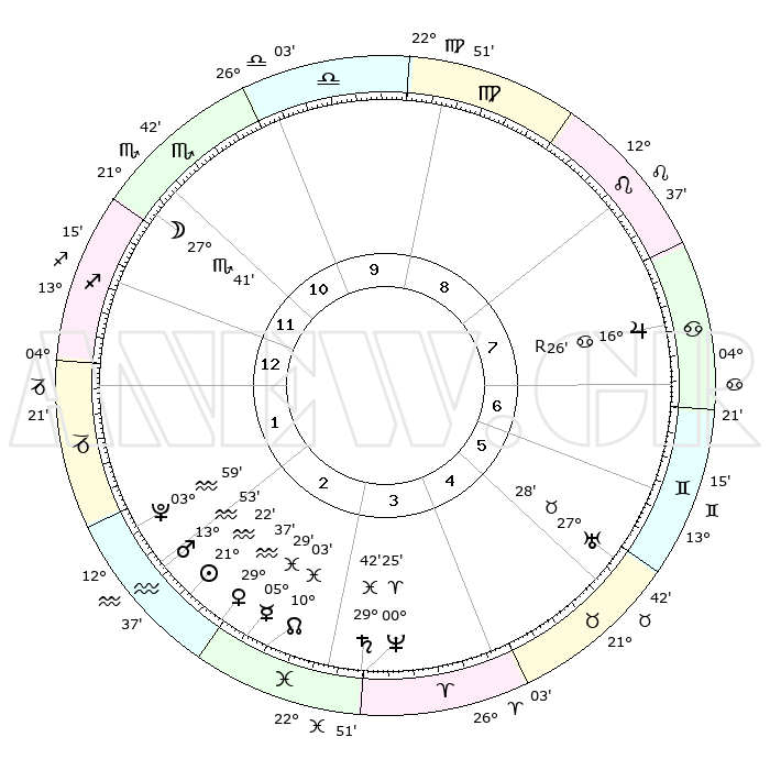 | | ΘΕΣΕΙΣ ΠΛΑΝΗΤΩΝ ΑΣΤΡΟΛΟΓΙΚΟΥ ΧΑΡΤΗ ΤΗΣ ΣΤΙΓΜΗΣ ΑΥΤΗΣ | | | | Πλανήτης | Ζώδιο | Μοίρες | Δεκαήμ. | Σε οίκο | Απόκλιση | | Ακμές των οίκων | | Ηλιος | Υδροχόος | 21°18' | Τρίτο | 2 | 14 S 24 | | 1ος | 14°07' | Τοξότης | | Σελήνη | Σκορπιός | 26°56' | Τρίτο | 12 | 24 S 28 | | 2ος | 17°37' | Αιγόκερως | | Ερμής | Ιχθείς | 05°22' | Πρώτο | 3 | 10 S 22 | | 3ος | 25°41' | Υδροχόος | | Αφροδίτη | Υδροχόος | 29°32' | Τρίτο | 3 | 13 S 00 | | 4ος | 01°28' | Κριός | | Αρης | Υδροχόος | 13°50' | Δεύτερο | 2 | 17 S 42 | | 5ος | 00°25' | Ταύρος | | Δίας | Καρκίνος | 16°26'R | Δεύτερο | 7 | 22 N 44 | | 6ος | 23°40' | Ταύρος | | Κρόνος | Ιχθείς | 29°41' | Τρίτο | 3 | 02 S 06 | | 7ος | 14°07' | Δίδυμοι | | Ουρανός | Ταύρος | 27°28' | Τρίτο | 6 | 19 N 25 | | 8ος | 17°37' | Καρκίνος | | Ποσειδώνας | Κριός | 00°25' | Πρώτο | 3 | 01 S 02 | | 9ος | 25°41' | Λέων | | Πλούτωνας | Υδροχόος | 03°59' | Πρώτο | 2 | 22 S 58 | | 10ος | 01°28' | Ζυγός | | Β. Δεσμός | Ιχθείς | 10°03' | Δεύτερο | 3 | 07 S 48 | | 11ος | 00°25' | Σκορπιός | | Ωροσκόπος | Τοξότης | 14°07' | Δεύτερο | | | 12ος | 23°40' | Σκορπιός | | Μεσουράνημα | Ζυγός | 01°28' | Πρώτο | | | |