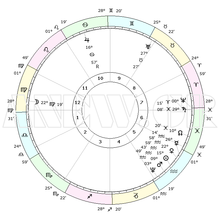 | | ΘΕΣΕΙΣ ΠΛΑΝΗΤΩΝ ΑΣΤΡΟΛΟΓΙΚΟΥ ΧΑΡΤΗ ΤΗΣ ΣΤΙΓΜΗΣ ΑΥΤΗΣ | | | | Πλανήτης | Ζώδιο | Μοίρες | Δεκαήμ. | Σε οίκο | Απόκλιση | | Ακμές των οίκων | | Ηλιος | Υδροχόος | 15°54' | Δεύτερο | 6 | 16 S 04 | | 1ος | 05°15' | Παρθένος | | Σελήνη | Παρθένος | 21°16' | Τρίτο | 1 | 02 N 26 | | 2ος | 29°39' | Παρθένος | | Ερμής | Υδροχόος | 26°05' | Τρίτο | 6 | 14 S 19 | | 3ος | 28°45' | Ζυγός | | Αφροδίτη | Υδροχόος | 22°52' | Τρίτο | 6 | 15 S 13 | | 4ος | 01°42' | Τοξότης | | Αρης | Υδροχόος | 09°39' | Πρώτο | 6 | 18 S 51 | | 5ος | 05°34' | Αιγόκερως | | Δίας | Καρκίνος | 16°57'R | Δεύτερο | 11 | 22 N 40 | | 6ος | 07°08' | Υδροχόος | | Κρόνος | Ιχθείς | 29°08' | Τρίτο | 7 | 02 S 20 | | 7ος | 05°15' | Ιχθείς | | Ουρανός | Ταύρος | 27°27' | Τρίτο | 9 | 19 N 24 | | 8ος | 29°39' | Ιχθείς | | Ποσειδώνας | Κριός | 00°15' | Πρώτο | 8 | 01 S 06 | | 9ος | 28°45' | Κριός | | Πλούτωνας | Υδροχόος | 03°49' | Πρώτο | 5 | 23 S 00 | | 10ος | 01°42' | Δίδυμοι | | Β. Δεσμός | Ιχθείς | 10°20' | Δεύτερο | 7 | 07 S 42 | | 11ος | 05°34' | Καρκίνος | | Ωροσκόπος | Παρθένος | 05°15' | Πρώτο | | | 12ος | 07°08' | Λέων | | Μεσουράνημα | Δίδυμοι | 01°42' | Πρώτο | | | |