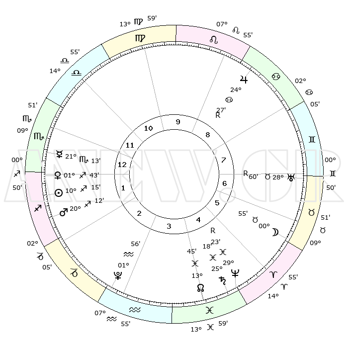 | | ΘΕΣΕΙΣ ΠΛΑΝΗΤΩΝ ΑΣΤΡΟΛΟΓΙΚΟΥ ΧΑΡΤΗ ΤΗΣ ΣΤΙΓΜΗΣ ΑΥΤΗΣ | | | | Πλανήτης | Ζώδιο | Μοίρες | Δεκαήμ. | Σε οίκο | Απόκλιση | | Ακμές των οίκων | | Ηλιος | Τοξότης | 10°13' | Δεύτερο | 1 | 21 S 59 | | 1ος | 21°32' | Σκορπιός | | Σελήνη | Ταύρος | 00°26' | Πρώτο | 6 | 15 N 01 | | 2ος | 21°38' | Τοξότης | | Ερμής | Σκορπιός | 21°12' | Τρίτο | 12 | 15 S 32 | | 3ος | 26°01' | Αιγόκερως | | Αφροδίτη | Τοξότης | 01°40' | Πρώτο | 1 | 19 S 51 | | 4ος | 01°42' | Ιχθείς | | Αρης | Τοξότης | 20°10' | Τρίτο | 1 | 23 S 44 | | 5ος | 03°39' | Κριός | | Δίας | Καρκίνος | 24°27'R | Τρίτο | 8 | 21 N 23 | | 6ος | 29°50' | Κριός | | Κρόνος | Ιχθείς | 25°18' | Τρίτο | 4 | 04 S 02 | | 7ος | 21°32' | Ταύρος | | Ουρανός | Ταύρος | 28°60'R | Τρίτο | 7 | 19 N 44 | | 8ος | 21°38' | Δίδυμοι | | Ποσειδώνας | Ιχθείς | 29°23'R | Τρίτο | 4 | 01 S 29 | | 9ος | 26°01' | Καρκίνος | | Πλούτωνας | Υδροχόος | 01°56' | Πρώτο | 3 | 23 S 24 | | 10ος | 01°42' | Παρθένος | | Β. Δεσμός | Ιχθείς | 13°45' | Δεύτερο | 4 | 06 S 23 | | 11ος | 03°39' | Ζυγός | | Ωροσκόπος | Σκορπιός | 21°32' | Τρίτο | | | 12ος | 29°50' | Ζυγός | | Μεσουράνημα | Παρθένος | 01°42' | Πρώτο | | | |