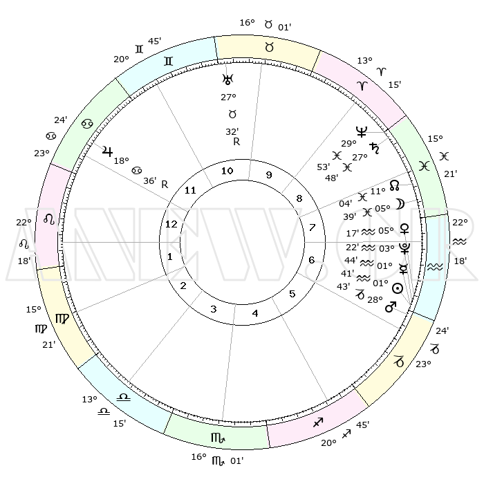| | ΘΕΣΕΙΣ ΠΛΑΝΗΤΩΝ ΑΣΤΡΟΛΟΓΙΚΟΥ ΧΑΡΤΗ ΤΗΣ ΣΤΙΓΜΗΣ ΑΥΤΗΣ | | | | Πλανήτης | Ζώδιο | Μοίρες | Δεκαήμ. | Σε οίκο | Απόκλιση | | Ακμές των οίκων | | Ηλιος | Υδροχόος | 01°36' | Πρώτο | 7 | 19 S 48 | | 1ος | 01°10' | Λέων | | Σελήνη | Ιχθείς | 04°42' | Πρώτο | 8 | 10 S 11 | | 2ος | 22°17' | Λέων | | Ερμής | Υδροχόος | 01°36' | Πρώτο | 7 | 21 S 48 | | 3ος | 17°29' | Παρθένος | | Αφροδίτη | Υδροχόος | 05°11' | Πρώτο | 7 | 20 S 05 | | 4ος | 18°40' | Ζυγός | | Αρης | Αιγόκερως | 28°39' | Τρίτο | 6 | 21 S 24 | | 5ος | 24°41' | Σκορπιός | | Δίας | Καρκίνος | 18°36'R | Δεύτερο | 12 | 22 N 25 | | 6ος | 00°12' | Αιγόκερως | | Κρόνος | Ιχθείς | 27°48' | Τρίτο | 9 | 02 S 54 | | 7ος | 01°10' | Υδροχόος | | Ουρανός | Ταύρος | 27°32'R | Τρίτο | 11 | 19 N 25 | | 8ος | 22°17' | Υδροχόος | | Ποσειδώνας | Ιχθείς | 29°53' | Τρίτο | 9 | 01 S 16 | | 9ος | 17°29' | Ιχθείς | | Πλούτωνας | Υδροχόος | 03°22' | Πρώτο | 7 | 23 S 05 | | 10ος | 18°40' | Κριός | | Β. Δεσμός | Ιχθείς | 11°05' | Δεύτερο | 8 | 07 S 25 | | 11ος | 24°41' | Ταύρος | | Ωροσκόπος | Λέων | 01°10' | Πρώτο | | | 12ος | 00°12' | Καρκίνος | | Μεσουράνημα | Κριός | 18°40' | Δεύτερο | | | |