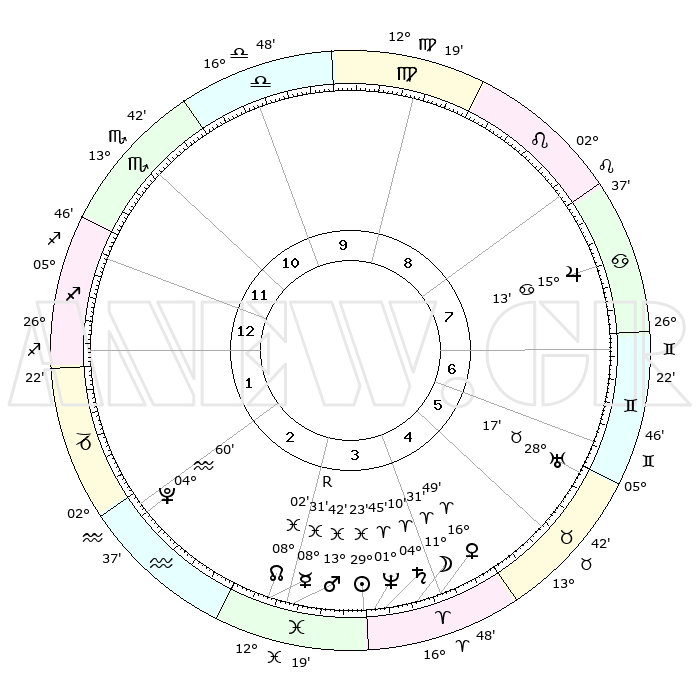 | | ΘΕΣΕΙΣ ΠΛΑΝΗΤΩΝ ΑΣΤΡΟΛΟΓΙΚΟΥ ΧΑΡΤΗ ΤΗΣ ΣΤΙΓΜΗΣ ΑΥΤΗΣ | | | | Πλανήτης | Ζώδιο | Μοίρες | Δεκαήμ. | Σε οίκο | Απόκλιση | | Ακμές των οίκων | | Ηλιος | Ιχθείς | 29°18' | Τρίτο | 4 | 00 S 17 | | 1ος | 03°37' | Τοξότης | | Σελήνη | Κριός | 10°27' | Δεύτερο | 4 | 06 N 40 | | 2ος | 05°16' | Αιγόκερως | | Ερμής | Ιχθείς | 08°32'R | Πρώτο | 3 | 07 S 15 | | 3ος | 11°35' | Υδροχόος | | Αφροδίτη | Κριός | 16°43' | Δεύτερο | 4 | 05 N 45 | | 4ος | 17°40' | Ιχθείς | | Αρης | Ιχθείς | 13°39' | Δεύτερο | 3 | 07 S 26 | | 5ος | 18°14' | Κριός | | Δίας | Καρκίνος | 15°13' | Δεύτερο | 8 | 22 N 56 | | 6ος | 12°48' | Ταύρος | | Κρόνος | Κριός | 04°09' | Πρώτο | 4 | 00 S 18 | | 7ος | 03°37' | Δίδυμοι | | Ουρανός | Ταύρος | 28°17' | Τρίτο | 6 | 19 N 36 | | 8ος | 05°16' | Καρκίνος | | Ποσειδώνας | Κριός | 01°45' | Πρώτο | 4 | 00 S 30 | | 9ος | 11°35' | Λέων | | Πλούτωνας | Υδροχόος | 04°60' | Πρώτο | 2 | 22 S 49 | | 10ος | 17°40' | Παρθένος | | Β. Δεσμός | Ιχθείς | 08°03' | Πρώτο | 3 | 08 S 33 | | 11ος | 18°14' | Ζυγός | | Ωροσκόπος | Τοξότης | 03°37' | Πρώτο | | | 12ος | 12°48' | Σκορπιός | | Μεσουράνημα | Παρθένος | 17°40' | Δεύτερο | | | |