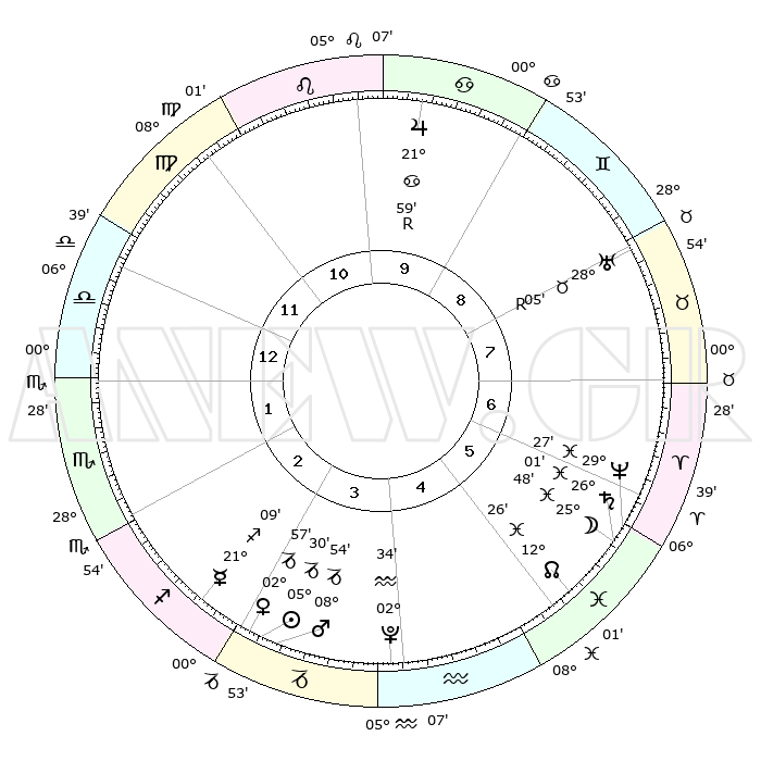 | | ΘΕΣΕΙΣ ΠΛΑΝΗΤΩΝ ΑΣΤΡΟΛΟΓΙΚΟΥ ΧΑΡΤΗ ΤΗΣ ΣΤΙΓΜΗΣ ΑΥΤΗΣ | | | | Πλανήτης | Ζώδιο | Μοίρες | Δεκαήμ. | Σε οίκο | Απόκλιση | | Ακμές των οίκων | | Ηλιος | Αιγόκερως | 05°25' | Πρώτο | 3 | 23 S 19 | | 1ος | 08°17' | Ζυγός | | Σελήνη | Ιχθείς | 24°47' | Τρίτο | 6 | 00 S 59 | | 2ος | 05°26' | Σκορπιός | | Ερμής | Τοξότης | 21°02' | Τρίτο | 3 | 23 S 07 | | 3ος | 06°11' | Τοξότης | | Αφροδίτη | Αιγόκερως | 02°52' | Πρώτο | 3 | 23 S 43 | | 4ος | 09°19' | Αιγόκερως | | Αρης | Αιγόκερως | 08°50' | Πρώτο | 3 | 24 S 00 | | 5ος | 12°15' | Υδροχόος | | Δίας | Καρκίνος | 21°60'R | Τρίτο | 10 | 21 N 52 | | 6ος | 12°21' | Ιχθείς | | Κρόνος | Ιχθείς | 26°01' | Τρίτο | 6 | 03 S 41 | | 7ος | 08°17' | Κριός | | Ουρανός | Ταύρος | 28°05'R | Τρίτο | 8 | 19 N 32 | | 8ος | 05°26' | Ταύρος | | Ποσειδώνας | Ιχθείς | 29°27' | Τρίτο | 6 | 01 S 27 | | 9ος | 06°11' | Δίδυμοι | | Πλούτωνας | Υδροχόος | 02°34' | Πρώτο | 4 | 23 S 15 | | 10ος | 09°19' | Καρκίνος | | Β. Δεσμός | Ιχθείς | 12°26' | Δεύτερο | 6 | 06 S 54 | | 11ος | 12°15' | Λέων | | Ωροσκόπος | Ζυγός | 08°17' | Πρώτο | | | 12ος | 12°21' | Παρθένος | | Μεσουράνημα | Καρκίνος | 09°19' | Πρώτο | | | |