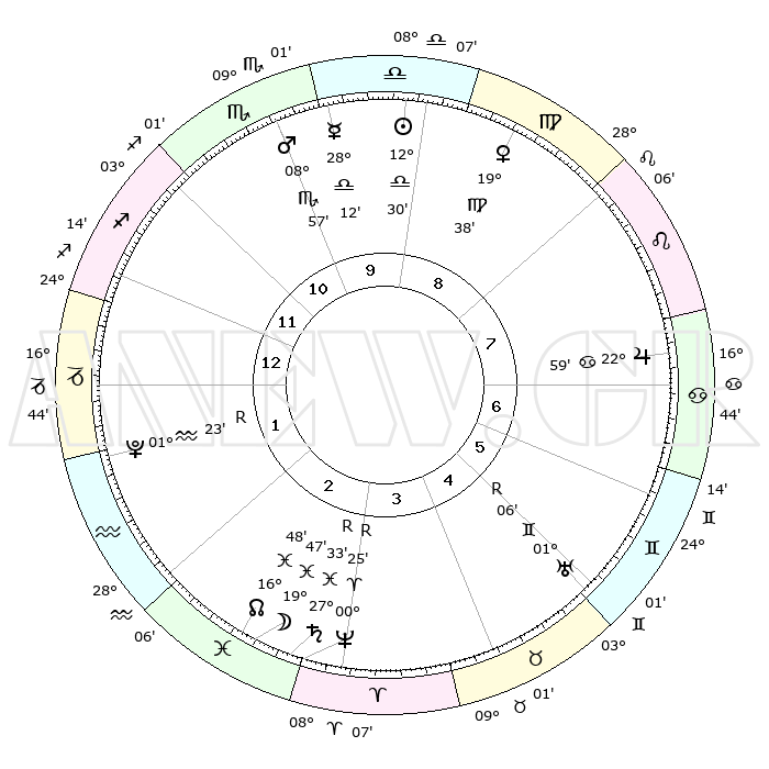 | ΘΕΣΕΙΣ ΠΛΑΝΗΤΩΝ ΑΣΤΡΟΛΟΓΙΚΟΥ ΧΑΡΤΗ ΤΗΣ ΣΤΙΓΜΗΣ ΑΥΤΗΣ | | Πλανήτης | Ζώδιο | Μοίρες | Δεκαήμ. | Σε οίκο | Απόκλιση | | Ακμές των οίκων | Ηλιος | Ζυγός | 12°24' | Δεύτερο | 10 | 04 S 54 | | 1ος | 10°54' | Τοξότης | Σελήνη | Ιχθείς | 18°14' | Δεύτερο | 3 | 04 S 39 | | 2ος | 13°48' | Αιγόκερως | Ερμής | Ζυγός | 28°02' | Τρίτο | 11 | 11 S 21 | | 3ος | 21°20' | Υδροχόος | Αφροδίτη | Παρθένος | 19°29' | Δεύτερο | 9 | 05 N 26 | | 4ος | 27°18' | Ιχθείς | Αρης | Σκορπιός | 08°52' | Πρώτο | 11 | 14 S 34 | | 5ος | 26°46' | Κριός | Δίας | Καρκίνος | 22°59' | Τρίτο | 8 | 21 N 30 | | 6ος | 20°24' | Ταύρος | Κρόνος | Ιχθείς | 27°34'R | Τρίτο | 4 | 03 S 16 | | 7ος | 10°54' | Δίδυμοι | Ουρανός | Δίδυμοι | 01°07'R | Πρώτο | 6 | 20 N 10 | | 8ος | 13°48' | Καρκίνος | Ποσειδώνας | Κριός | 00°26'R | Πρώτο | 4 | 01 S 05 | | 9ος | 21°20' | Λέων | Πλούτωνας | Υδροχόος | 01°23'R | Πρώτο | 2 | 23 S 32 | | 10ος | 27°18' | Παρθένος | Β. Δεσμός | Ιχθείς | 16°49' | Δεύτερο | 3 | 05 S 12 | | 11ος | 26°46' | Ζυγός | Ωροσκόπος | Τοξότης | 10°54' | Δεύτερο | | | 12ος | 20°24' | Σκορπιός | Μεσουράνημα | Παρθένος | 27°18' | Τρίτο | | | |