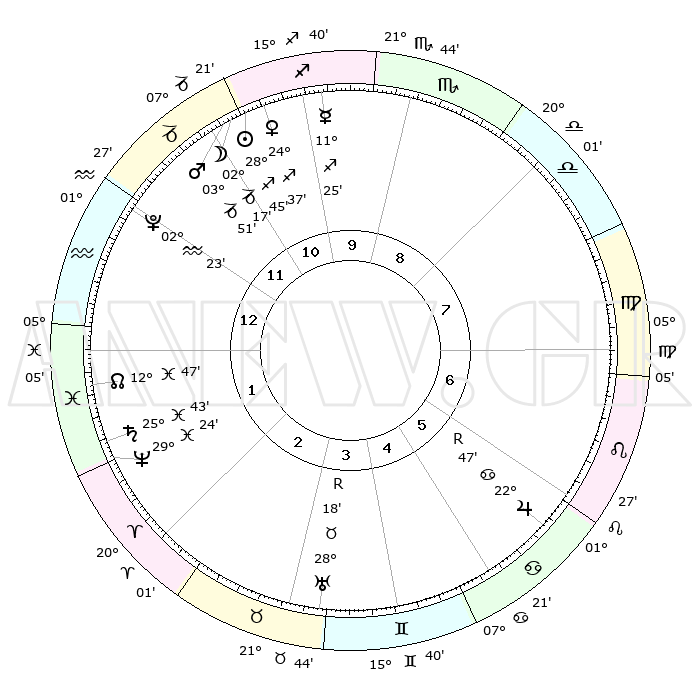 | | ΘΕΣΕΙΣ ΠΛΑΝΗΤΩΝ ΑΣΤΡΟΛΟΓΙΚΟΥ ΧΑΡΤΗ ΤΗΣ ΣΤΙΓΜΗΣ ΑΥΤΗΣ | | | | Πλανήτης | Ζώδιο | Μοίρες | Δεκαήμ. | Σε οίκο | Απόκλιση | | Ακμές των οίκων | | Ηλιος | Τοξότης | 28°40' | Τρίτο | 11 | 23 S 26 | | 1ος | 00°56' | Υδροχόος | | Σελήνη | Αιγόκερως | 01°27' | Πρώτο | 11 | 28 S 09 | | 2ος | 15°11' | Ιχθείς | | Ερμής | Τοξότης | 11°19' | Δεύτερο | 10 | 21 S 17 | | 3ος | 23°29' | Κριός | | Αφροδίτη | Τοξότης | 24°31' | Τρίτο | 11 | 23 S 22 | | 4ος | 21°47' | Ταύρος | | Αρης | Αιγόκερως | 03°48' | Πρώτο | 11 | 24 S 11 | | 5ος | 14°29' | Δίδυμοι | | Δίας | Καρκίνος | 22°47'R | Τρίτο | 6 | 21 N 43 | | 6ος | 05°56' | Καρκίνος | | Κρόνος | Ιχθείς | 25°43' | Τρίτο | 2 | 03 S 49 | | 7ος | 00°56' | Λέων | | Ουρανός | Ταύρος | 28°18'R | Τρίτο | 4 | 19 N 35 | | 8ος | 15°11' | Παρθένος | | Ποσειδώνας | Ιχθείς | 29°24' | Τρίτο | 2 | 01 S 28 | | 9ος | 23°29' | Ζυγός | | Πλούτωνας | Υδροχόος | 02°23' | Πρώτο | 1 | 23 S 18 | | 10ος | 21°47' | Σκορπιός | | Β. Δεσμός | Ιχθείς | 12°47' | Δεύτερο | 1 | 06 S 45 | | 11ος | 14°29' | Τοξότης | | Ωροσκόπος | Υδροχόος | 00°56' | Πρώτο | | | 12ος | 05°56' | Αιγόκερως | | Μεσουράνημα | Σκορπιός | 21°47' | Τρίτο | | | |