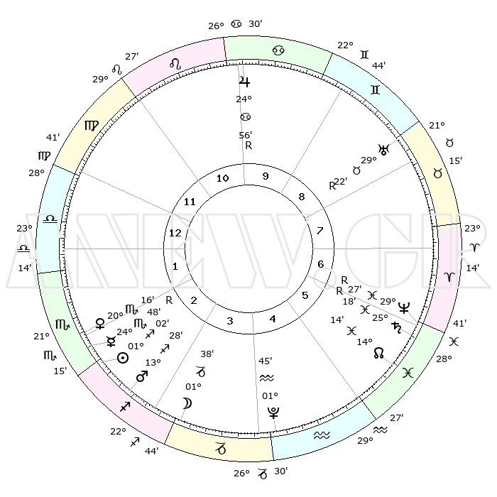 | | ΘΕΣΕΙΣ ΠΛΑΝΗΤΩΝ ΑΣΤΡΟΛΟΓΙΚΟΥ ΧΑΡΤΗ ΤΗΣ ΣΤΙΓΜΗΣ ΑΥΤΗΣ | | | | Πλανήτης | Ζώδιο | Μοίρες | Δεκαήμ. | Σε οίκο | Απόκλιση | | Ακμές των οίκων | | Ηλιος | Τοξότης | 00°58' | Πρώτο | 2 | 20 S 21 | | 1ος | 04°28' | Ζυγός | | Σελήνη | Αιγόκερως | 00°52' | Πρώτο | 3 | 28 S 14 | | 2ος | 01°22' | Σκορπιός | | Ερμής | Σκορπιός | 24°53'R | Τρίτο | 2 | 17 S 39 | | 3ος | 01°58' | Τοξότης | | Αφροδίτη | Σκορπιός | 20°11' | Τρίτο | 2 | 16 S 51 | | 4ος | 05°01' | Αιγόκερως | | Αρης | Τοξότης | 13°25' | Δεύτερο | 3 | 23 S 00 | | 5ος | 07°57' | Υδροχόος | | Δίας | Καρκίνος | 24°56'R | Τρίτο | 10 | 21 N 16 | | 6ος | 08°12' | Ιχθείς | | Κρόνος | Ιχθείς | 25°18'R | Τρίτο | 6 | 04 S 04 | | 7ος | 04°28' | Κριός | | Ουρανός | Ταύρος | 29°23'R | Τρίτο | 8 | 19 N 49 | | 8ος | 01°22' | Ταύρος | | Ποσειδώνας | Ιχθείς | 29°27'R | Τρίτο | 6 | 01 S 28 | | 9ος | 01°58' | Δίδυμοι | | Πλούτωνας | Υδροχόος | 01°45' | Πρώτο | 4 | 23 S 26 | | 10ος | 05°01' | Καρκίνος | | Β. Δεσμός | Ιχθείς | 14°14' | Δεύτερο | 6 | 06 S 12 | | 11ος | 07°57' | Λέων | | Ωροσκόπος | Ζυγός | 04°28' | Πρώτο | | | 12ος | 08°12' | Παρθένος | | Μεσουράνημα | Καρκίνος | 05°01' | Πρώτο | | | |