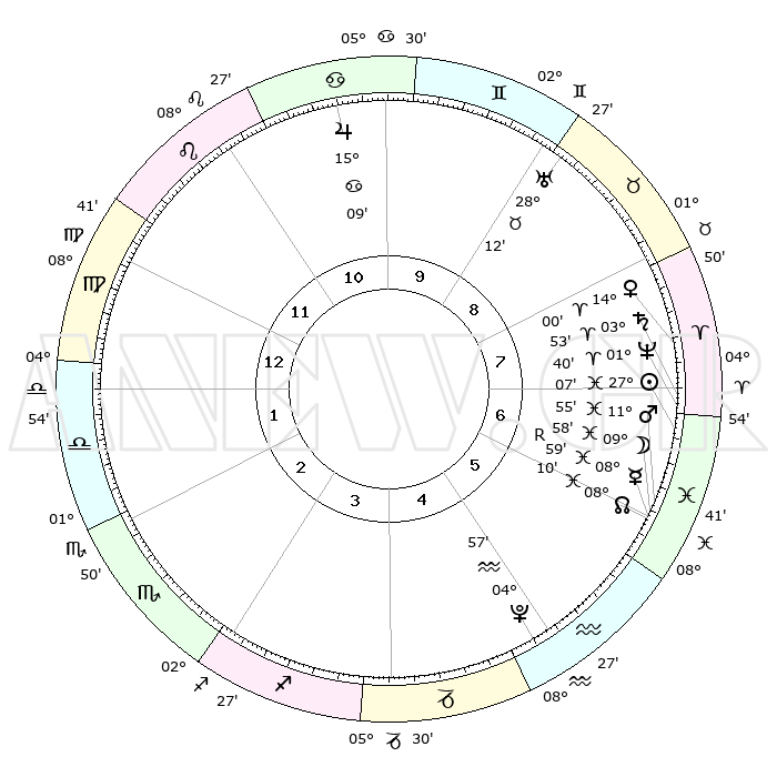 | | ΘΕΣΕΙΣ ΠΛΑΝΗΤΩΝ ΑΣΤΡΟΛΟΓΙΚΟΥ ΧΑΡΤΗ ΤΗΣ ΣΤΙΓΜΗΣ ΑΥΤΗΣ | | | | Πλανήτης | Ζώδιο | Μοίρες | Δεκαήμ. | Σε οίκο | Απόκλιση | | Ακμές των οίκων | | Ηλιος | Ιχθείς | 27°03' | Τρίτο | 7 | 01 S 10 | | 1ος | 14°39' | Παρθένος | | Σελήνη | Ιχθείς | 09°03' | Πρώτο | 6 | 08 S 10 | | 2ος | 09°58' | Ζυγός | | Ερμής | Ιχθείς | 09°00'R | Πρώτο | 6 | 06 S 33 | | 3ος | 09°42' | Σκορπιός | | Αφροδίτη | Κριός | 13°55' | Δεύτερο | 8 | 04 N 36 | | 4ος | 12°38' | Τοξότης | | Αρης | Ιχθείς | 11°52' | Δεύτερο | 6 | 08 S 07 | | 5ος | 16°01' | Αιγόκερως | | Δίας | Καρκίνος | 15°09' | Δεύτερο | 10 | 22 N 56 | | 6ος | 17°04' | Υδροχόος | | Κρόνος | Κριός | 03°52' | Πρώτο | 7 | 00 S 25 | | 7ος | 14°39' | Ιχθείς | | Ουρανός | Ταύρος | 28°12' | Τρίτο | 9 | 19 N 35 | | 8ος | 09°58' | Κριός | | Ποσειδώνας | Κριός | 01°40' | Πρώτο | 7 | 00 S 32 | | 9ος | 09°42' | Ταύρος | | Πλούτωνας | Υδροχόος | 04°57' | Πρώτο | 5 | 22 S 49 | | 10ος | 12°38' | Δίδυμοι | | Β. Δεσμός | Ιχθείς | 08°10' | Πρώτο | 6 | 08 S 30 | | 11ος | 16°01' | Καρκίνος | | Ωροσκόπος | Παρθένος | 14°39' | Δεύτερο | | | 12ος | 17°04' | Λέων | | Μεσουράνημα | Δίδυμοι | 12°38' | Δεύτερο | | | |