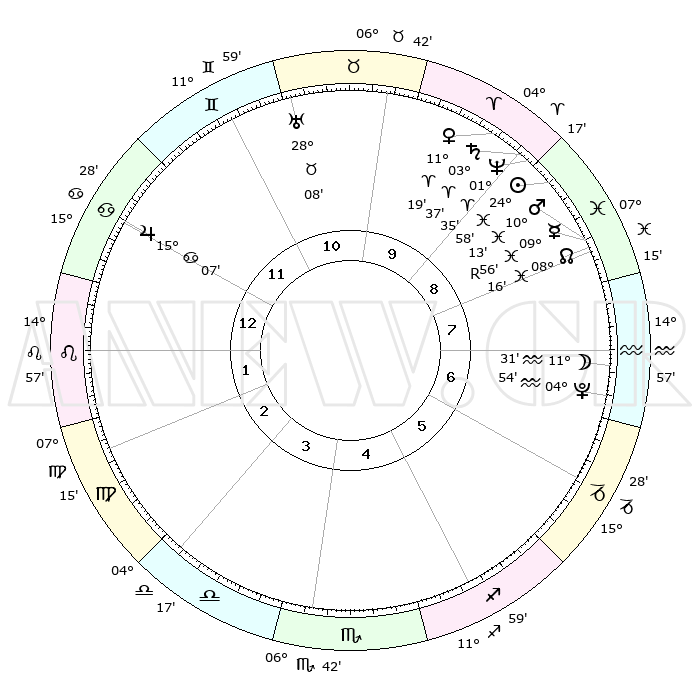 | | ΘΕΣΕΙΣ ΠΛΑΝΗΤΩΝ ΑΣΤΡΟΛΟΓΙΚΟΥ ΧΑΡΤΗ ΤΗΣ ΣΤΙΓΜΗΣ ΑΥΤΗΣ | | | | Πλανήτης | Ζώδιο | Μοίρες | Δεκαήμ. | Σε οίκο | Απόκλιση | | Ακμές των οίκων | | Ηλιος | Ιχθείς | 24°55' | Τρίτο | 9 | 02 S 01 | | 1ος | 00°26' | Λέων | | Σελήνη | Υδροχόος | 10°53' | Δεύτερο | 7 | 19 S 53 | | 2ος | 21°30' | Λέων | | Ερμής | Ιχθείς | 09°57'R | Πρώτο | 8 | 05 S 42 | | 3ος | 16°36' | Παρθένος | | Αφροδίτη | Κριός | 11°15' | Δεύτερο | 9 | 03 N 30 | | 4ος | 17°42' | Ζυγός | | Αρης | Ιχθείς | 10°11' | Δεύτερο | 8 | 08 S 45 | | 5ος | 23°44' | Σκορπιός | | Δίας | Καρκίνος | 15°07' | Δεύτερο | 12 | 22 N 56 | | 6ος | 29°22' | Τοξότης | | Κρόνος | Κριός | 03°36' | Πρώτο | 9 | 00 S 31 | | 7ος | 00°26' | Υδροχόος | | Ουρανός | Ταύρος | 28°08' | Τρίτο | 11 | 19 N 34 | | 8ος | 21°30' | Υδροχόος | | Ποσειδώνας | Κριός | 01°35' | Πρώτο | 9 | 00 S 34 | | 9ος | 16°36' | Ιχθείς | | Πλούτωνας | Υδροχόος | 04°54' | Πρώτο | 7 | 22 S 49 | | 10ος | 17°42' | Κριός | | Β. Δεσμός | Ιχθείς | 08°17' | Πρώτο | 8 | 08 S 28 | | 11ος | 23°44' | Ταύρος | | Ωροσκόπος | Λέων | 00°26' | Πρώτο | | | 12ος | 29°22' | Δίδυμοι | | Μεσουράνημα | Κριός | 17°42' | Δεύτερο | | | |
