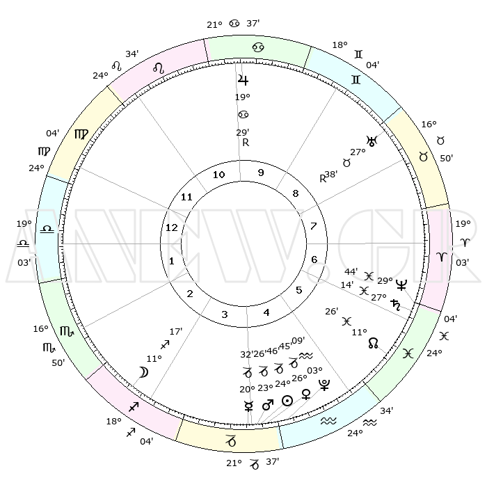 | | ΘΕΣΕΙΣ ΠΛΑΝΗΤΩΝ ΑΣΤΡΟΛΟΓΙΚΟΥ ΧΑΡΤΗ ΤΗΣ ΣΤΙΓΜΗΣ ΑΥΤΗΣ | | | | Πλανήτης | Ζώδιο | Μοίρες | Δεκαήμ. | Σε οίκο | Απόκλιση | | Ακμές των οίκων | | Ηλιος | Αιγόκερως | 24°41' | Τρίτο | 4 | 21 S 11 | | 1ος | 25°19' | Παρθένος | | Σελήνη | Τοξότης | 10°19' | Δεύτερο | 3 | 27 S 03 | | 2ος | 21°33' | Ζυγός | | Ερμής | Αιγόκερως | 20°24' | Τρίτο | 4 | 23 S 38 | | 3ος | 21°48' | Σκορπιός | | Αφροδίτη | Αιγόκερως | 26°39' | Τρίτο | 4 | 21 S 47 | | 4ος | 24°45' | Τοξότης | | Αρης | Αιγόκερως | 23°22' | Τρίτο | 4 | 22 S 22 | | 5ος | 27°48' | Αιγόκερως | | Δίας | Καρκίνος | 19°30'R | Δεύτερο | 10 | 22 N 17 | | 6ος | 28°24' | Υδροχόος | | Κρόνος | Ιχθείς | 27°14' | Τρίτο | 7 | 03 S 08 | | 7ος | 25°19' | Ιχθείς | | Ουρανός | Ταύρος | 27°38'R | Τρίτο | 9 | 19 N 26 | | 8ος | 21°33' | Κριός | | Ποσειδώνας | Ιχθείς | 29°44' | Τρίτο | 7 | 01 S 19 | | 9ος | 21°48' | Ταύρος | | Πλούτωνας | Υδροχόος | 03°09' | Πρώτο | 5 | 23 S 08 | | 10ος | 24°45' | Δίδυμοι | | Β. Δεσμός | Ιχθείς | 11°26' | Δεύτερο | 6 | 07 S 16 | | 11ος | 27°48' | Καρκίνος | | Ωροσκόπος | Παρθένος | 25°19' | Τρίτο | | | 12ος | 28°24' | Λέων | | Μεσουράνημα | Δίδυμοι | 24°45' | Τρίτο | | | |