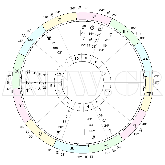 | | ΘΕΣΕΙΣ ΠΛΑΝΗΤΩΝ ΑΣΤΡΟΛΟΓΙΚΟΥ ΧΑΡΤΗ ΤΗΣ ΣΤΙΓΜΗΣ ΑΥΤΗΣ | | | | Πλανήτης | Ζώδιο | Μοίρες | Δεκαήμ. | Σε οίκο | Απόκλιση | | Ακμές των οίκων | | Ηλιος | Τοξότης | 14°30' | Δεύτερο | 10 | 22 S 32 | | 1ος | 11°12' | Υδροχόος | | Σελήνη | Καρκίνος | 04°34' | Πρώτο | 5 | 28 N 01 | | 2ος | 26°40' | Ιχθείς | | Ερμής | Σκορπιός | 23°60' | Τρίτο | 9 | 16 S 24 | | 3ος | 03°08' | Ταύρος | | Αφροδίτη | Τοξότης | 06°59' | Πρώτο | 10 | 20 S 58 | | 4ος | 29°49' | Ταύρος | | Αρης | Τοξότης | 23°19' | Τρίτο | 11 | 23 S 58 | | 5ος | 21°55' | Δίδυμοι | | Δίας | Καρκίνος | 24°09'R | Τρίτο | 6 | 21 N 27 | | 6ος | 13°54' | Καρκίνος | | Κρόνος | Ιχθείς | 25°20' | Τρίτο | 1 | 04 S 00 | | 7ος | 11°12' | Λέων | | Ουρανός | Ταύρος | 28°50'R | Τρίτο | 3 | 19 N 42 | | 8ος | 26°40' | Παρθένος | | Ποσειδώνας | Ιχθείς | 29°23'R | Τρίτο | 2 | 01 S 29 | | 9ος | 03°08' | Σκορπιός | | Πλούτωνας | Υδροχόος | 02°02' | Πρώτο | 12 | 23 S 22 | | 10ος | 29°49' | Σκορπιός | | Β. Δεσμός | Ιχθείς | 13°32' | Δεύτερο | 1 | 06 S 29 | | 11ος | 21°55' | Τοξότης | | Ωροσκόπος | Υδροχόος | 11°12' | Δεύτερο | | | 12ος | 13°54' | Αιγόκερως | | Μεσουράνημα | Σκορπιός | 29°49' | Τρίτο | | | |