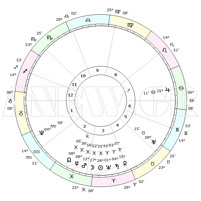 | | ΘΕΣΕΙΣ ΠΛΑΝΗΤΩΝ ΑΣΤΡΟΛΟΓΙΚΟΥ ΧΑΡΤΗ ΤΗΣ ΣΤΙΓΜΗΣ ΑΥΤΗΣ | | | | Πλανήτης | Ζώδιο | Μοίρες | Δεκαήμ. | Σε οίκο | Απόκλιση | | Ακμές των οίκων | | Ηλιος | Ιχθείς | 28°21' | Τρίτο | 3 | 00 S 39 | | 1ος | 14°00' | Τοξότης | | Σελήνη | Ιχθείς | 26°55' | Τρίτο | 3 | 00 N 16 | | 2ος | 17°29' | Αιγόκερως | | Ερμής | Ιχθείς | 08°40'R | Πρώτο | 3 | 06 S 59 | | 3ος | 25°32' | Υδροχόος | | Αφροδίτη | Κριός | 15°32' | Δεύτερο | 4 | 05 N 15 | | 4ος | 01°19' | Κριός | | Αρης | Ιχθείς | 12°53' | Δεύτερο | 3 | 07 S 43 | | 5ος | 00°18' | Ταύρος | | Δίας | Καρκίνος | 15°11' | Δεύτερο | 7 | 22 N 56 | | 6ος | 23°33' | Ταύρος | | Κρόνος | Κριός | 04°02' | Πρώτο | 4 | 00 S 21 | | 7ος | 14°00' | Δίδυμοι | | Ουρανός | Ταύρος | 28°15' | Τρίτο | 6 | 19 N 36 | | 8ος | 17°29' | Καρκίνος | | Ποσειδώνας | Κριός | 01°43' | Πρώτο | 4 | 00 S 31 | | 9ος | 25°32' | Λέων | | Πλούτωνας | Υδροχόος | 04°58' | Πρώτο | 2 | 22 S 49 | | 10ος | 01°19' | Ζυγός | | Β. Δεσμός | Ιχθείς | 08°06' | Πρώτο | 3 | 08 S 32 | | 11ος | 00°18' | Σκορπιός | | Ωροσκόπος | Τοξότης | 14°00' | Δεύτερο | | | 12ος | 23°33' | Σκορπιός | | Μεσουράνημα | Ζυγός | 01°19' | Πρώτο | | | |