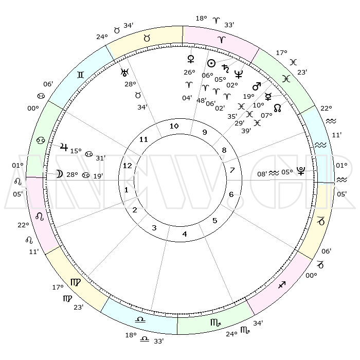 | | ΘΕΣΕΙΣ ΠΛΑΝΗΤΩΝ ΑΣΤΡΟΛΟΓΙΚΟΥ ΧΑΡΤΗ ΤΗΣ ΣΤΙΓΜΗΣ ΑΥΤΗΣ | | | | Πλανήτης | Ζώδιο | Μοίρες | Δεκαήμ. | Σε οίκο | Απόκλιση | | Ακμές των οίκων | | Ηλιος | Κριός | 06°41' | Πρώτο | 10 | 02 N 39 | | 1ος | 25°34' | Δίδυμοι | | Σελήνη | Καρκίνος | 26°44' | Τρίτο | 2 | 24 N 14 | | 2ος | 16°40' | Καρκίνος | | Ερμής | Ιχθείς | 10°25' | Δεύτερο | 10 | 08 S 06 | | 3ος | 08°13' | Λέων | | Αφροδίτη | Κριός | 25°55' | Τρίτο | 11 | 09 N 26 | | 4ος | 03°51' | Παρθένος | | Αρης | Ιχθείς | 19°29' | Δεύτερο | 10 | 05 S 08 | | 5ος | 07°03' | Ζυγός | | Δίας | Καρκίνος | 15°31' | Δεύτερο | 1 | 22 N 54 | | 6ος | 17°17' | Σκορπιός | | Κρόνος | Κριός | 05°05' | Πρώτο | 10 | 00 N 04 | | 7ος | 25°34' | Τοξότης | | Ουρανός | Ταύρος | 28°34' | Τρίτο | 12 | 19 N 40 | | 8ος | 16°40' | Αιγόκερως | | Ποσειδώνας | Κριός | 02°02' | Πρώτο | 10 | 00 S 23 | | 9ος | 08°13' | Υδροχόος | | Πλούτωνας | Υδροχόος | 05°08' | Πρώτο | 8 | 22 S 48 | | 10ος | 03°51' | Ιχθείς | | Β. Δεσμός | Ιχθείς | 07°39' | Πρώτο | 10 | 08 S 42 | | 11ος | 07°03' | Κριός | | Ωροσκόπος | Δίδυμοι | 25°34' | Τρίτο | | | 12ος | 17°17' | Ταύρος | | Μεσουράνημα | Ιχθείς | 03°51' | Πρώτο | | | |