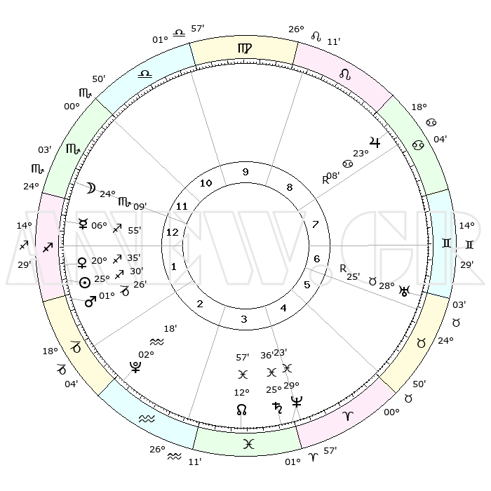 | | ΘΕΣΕΙΣ ΠΛΑΝΗΤΩΝ ΑΣΤΡΟΛΟΓΙΚΟΥ ΧΑΡΤΗ ΤΗΣ ΣΤΙΓΜΗΣ ΑΥΤΗΣ | | | | Πλανήτης | Ζώδιο | Μοίρες | Δεκαήμ. | Σε οίκο | Απόκλιση | | Ακμές των οίκων | | Ηλιος | Τοξότης | 24°25' | Τρίτο | 1 | 23 S 19 | | 1ος | 25°34' | Σκορπιός | | Σελήνη | Σκορπιός | 11°35' | Δεύτερο | 12 | 19 S 23 | | 2ος | 26°08' | Τοξότης | | Ερμής | Τοξότης | 05°28' | Πρώτο | 1 | 19 S 50 | | 3ος | 01°07' | Υδροχόος | | Αφροδίτη | Τοξότης | 19°15' | Δεύτερο | 1 | 22 S 53 | | 4ος | 07°01' | Ιχθείς | | Αρης | Αιγόκερως | 00°38' | Πρώτο | 2 | 24 S 13 | | 5ος | 08°34' | Κριός | | Δίας | Καρκίνος | 23°15'R | Τρίτο | 8 | 21 N 38 | | 6ος | 04°13' | Ταύρος | | Κρόνος | Ιχθείς | 25°34' | Τρίτο | 4 | 03 S 53 | | 7ος | 25°34' | Ταύρος | | Ουρανός | Ταύρος | 28°27'R | Τρίτο | 7 | 19 N 37 | | 8ος | 26°08' | Δίδυμοι | | Ποσειδώνας | Ιχθείς | 29°23' | Τρίτο | 4 | 01 S 29 | | 9ος | 01°07' | Λέων | | Πλούτωνας | Υδροχόος | 02°16' | Πρώτο | 3 | 23 S 19 | | 10ος | 07°01' | Παρθένος | | Β. Δεσμός | Ιχθείς | 13°01' | Δεύτερο | 4 | 06 S 40 | | 11ος | 08°34' | Ζυγός | | Ωροσκόπος | Σκορπιός | 25°34' | Τρίτο | | | 12ος | 04°13' | Σκορπιός | | Μεσουράνημα | Παρθένος | 07°01' | Πρώτο | | | |
