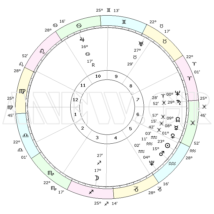 | | ΘΕΣΕΙΣ ΠΛΑΝΗΤΩΝ ΑΣΤΡΟΛΟΓΙΚΟΥ ΧΑΡΤΗ ΤΗΣ ΣΤΙΓΜΗΣ ΑΥΤΗΣ | | | | Πλανήτης | Ζώδιο | Μοίρες | Δεκαήμ. | Σε οίκο | Απόκλιση | | Ακμές των οίκων | | Ηλιος | Υδροχόος | 22°59' | Τρίτο | 6 | 13 S 51 | | 1ος | 04°45' | Παρθένος | | Σελήνη | Τοξότης | 16°36' | Δεύτερο | 4 | 27 S 57 | | 2ος | 29°05' | Παρθένος | | Ερμής | Ιχθείς | 08°08' | Πρώτο | 7 | 09 S 05 | | 3ος | 28°10' | Ζυγός | | Αφροδίτη | Ιχθείς | 01°36' | Πρώτο | 6 | 12 S 16 | | 4ος | 01°07' | Τοξότης | | Αρης | Υδροχόος | 15°08' | Δεύτερο | 6 | 17 S 19 | | 5ος | 04°60' | Αιγόκερως | | Δίας | Καρκίνος | 16°18'R | Δεύτερο | 11 | 22 N 46 | | 6ος | 06°36' | Υδροχόος | | Κρόνος | Ιχθείς | 29°52' | Τρίτο | 8 | 02 S 02 | | 7ος | 04°45' | Ιχθείς | | Ουρανός | Ταύρος | 27°29' | Τρίτο | 9 | 19 N 25 | | 8ος | 29°05' | Ιχθείς | | Ποσειδώνας | Κριός | 00°28' | Πρώτο | 8 | 01 S 01 | | 9ος | 28°10' | Κριός | | Πλούτωνας | Υδροχόος | 04°02' | Πρώτο | 5 | 22 S 58 | | 10ος | 01°07' | Δίδυμοι | | Β. Δεσμός | Ιχθείς | 09°58' | Πρώτο | 7 | 07 S 50 | | 11ος | 04°60' | Καρκίνος | | Ωροσκόπος | Παρθένος | 04°45' | Πρώτο | | | 12ος | 06°36' | Λέων | | Μεσουράνημα | Δίδυμοι | 01°07' | Πρώτο | | | |