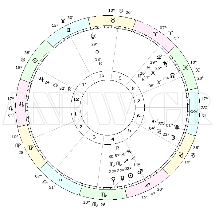 | | ΘΕΣΕΙΣ ΠΛΑΝΗΤΩΝ ΑΣΤΡΟΛΟΓΙΚΟΥ ΧΑΡΤΗ ΤΗΣ ΣΤΙΓΜΗΣ ΑΥΤΗΣ | | | | Πλανήτης | Ζώδιο | Μοίρες | Δεκαήμ. | Σε οίκο | Απόκλιση | | Ακμές των οίκων | | Ηλιος | Τοξότης | 02°46' | Πρώτο | 5 | 20 S 42 | | 1ος | 29°32' | Καρκίνος | | Σελήνη | Αιγόκερως | 22°18' | Τρίτο | 6 | 25 S 30 | | 2ος | 20°32' | Λέων | | Ερμής | Σκορπιός | 23°00'R | Τρίτο | 5 | 16 S 44 | | 3ος | 15°32' | Παρθένος | | Αφροδίτη | Σκορπιός | 22°25' | Τρίτο | 4 | 17 S 29 | | 4ος | 16°30' | Ζυγός | | Αρης | Τοξότης | 14°43' | Δεύτερο | 5 | 23 S 10 | | 5ος | 22°33' | Σκορπιός | | Δίας | Καρκίνος | 24°52'R | Τρίτο | 12 | 21 N 17 | | 6ος | 28°20' | Τοξότης | | Κρόνος | Ιχθείς | 25°18'R | Τρίτο | 9 | 04 S 04 | | 7ος | 29°32' | Αιγόκερως | | Ουρανός | Ταύρος | 29°18'R | Τρίτο | 11 | 19 N 48 | | 8ος | 20°32' | Υδροχόος | | Ποσειδώνας | Ιχθείς | 29°26'R | Τρίτο | 9 | 01 S 28 | | 9ος | 15°31' | Ιχθείς | | Πλούτωνας | Υδροχόος | 01°47' | Πρώτο | 7 | 23 S 26 | | 10ος | 16°30' | Κριός | | Β. Δεσμός | Ιχθείς | 14°08' | Δεύτερο | 8 | 06 S 14 | | 11ος | 22°33' | Ταύρος | | Ωροσκόπος | Καρκίνος | 29°32' | Τρίτο | | | 12ος | 28°20' | Δίδυμοι | | Μεσουράνημα | Κριός | 16°30' | Δεύτερο | | | |