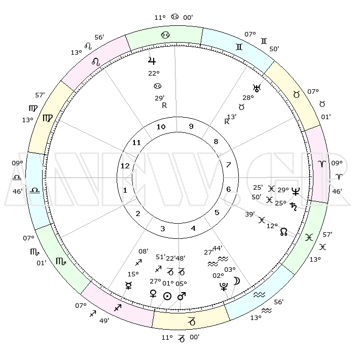 | | ΘΕΣΕΙΣ ΠΛΑΝΗΤΩΝ ΑΣΤΡΟΛΟΓΙΚΟΥ ΧΑΡΤΗ ΤΗΣ ΣΤΙΓΜΗΣ ΑΥΤΗΣ | | | | Πλανήτης | Ζώδιο | Μοίρες | Δεκαήμ. | Σε οίκο | Απόκλιση | | Ακμές των οίκων | | Ηλιος | Αιγόκερως | 01°17' | Πρώτο | 4 | 23 S 26 | | 1ος | 16°02' | Παρθένος | | Σελήνη | Υδροχόος | 02°44' | Πρώτο | 5 | 22 S 36 | | 2ος | 11°28' | Ζυγός | | Ερμής | Τοξότης | 15°01' | Δεύτερο | 4 | 22 S 04 | | 3ος | 11°17' | Σκορπιός | | Αφροδίτη | Τοξότης | 27°45' | Τρίτο | 4 | 23 S 34 | | 4ος | 14°13' | Τοξότης | | Αρης | Αιγόκερως | 05°44' | Πρώτο | 4 | 24 S 08 | | 5ος | 17°33' | Αιγόκερως | | Δίας | Καρκίνος | 22°30'R | Τρίτο | 11 | 21 N 46 | | 6ος | 18°32' | Υδροχόος | | Κρόνος | Ιχθείς | 25°49' | Τρίτο | 7 | 03 S 46 | | 7ος | 16°02' | Ιχθείς | | Ουρανός | Ταύρος | 28°13'R | Τρίτο | 9 | 19 N 34 | | 8ος | 11°29' | Κριός | | Ποσειδώνας | Ιχθείς | 29°25' | Τρίτο | 7 | 01 S 28 | | 9ος | 11°17' | Ταύρος | | Πλούτωνας | Υδροχόος | 02°27' | Πρώτο | 5 | 23 S 17 | | 10ος | 14°13' | Δίδυμοι | | Β. Δεσμός | Ιχθείς | 12°39' | Δεύτερο | 6 | 06 S 49 | | 11ος | 17°33' | Καρκίνος | | Ωροσκόπος | Παρθένος | 16°02' | Δεύτερο | | | 12ος | 18°32' | Λέων | | Μεσουράνημα | Δίδυμοι | 14°13' | Δεύτερο | | | |