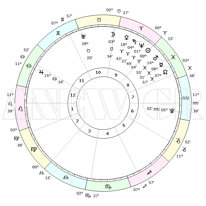 | | ΘΕΣΕΙΣ ΠΛΑΝΗΤΩΝ ΑΣΤΡΟΛΟΓΙΚΟΥ ΧΑΡΤΗ ΤΗΣ ΣΤΙΓΜΗΣ ΑΥΤΗΣ | | | | Πλανήτης | Ζώδιο | Μοίρες | Δεκαήμ. | Σε οίκο | Απόκλιση | | Ακμές των οίκων | | Ηλιος | Κριός | 00°51' | Πρώτο | 9 | 00 N 20 | | 1ος | 23°36' | Καρκίνος | | Σελήνη | Ταύρος | 02°40' | Πρώτο | 10 | 16 N 22 | | 2ος | 14°17' | Λέων | | Ερμής | Ιχθείς | 08°31' | Πρώτο | 9 | 07 S 36 | | 3ος | 08°29' | Παρθένος | | Αφροδίτη | Κριός | 18°38' | Δεύτερο | 10 | 06 N 31 | | 4ος | 08°39' | Ζυγός | | Αρης | Ιχθείς | 14°52' | Δεύτερο | 9 | 06 S 57 | | 5ος | 14°43' | Σκορπιός | | Δίας | Καρκίνος | 15°16' | Δεύτερο | 12 | 22 N 55 | | 6ος | 21°30' | Τοξότης | | Κρόνος | Κριός | 04°21' | Πρώτο | 9 | 00 S 13 | | 7ος | 23°36' | Αιγόκερως | | Ουρανός | Ταύρος | 28°20' | Τρίτο | 11 | 19 N 37 | | 8ος | 14°17' | Υδροχόος | | Ποσειδώνας | Κριός | 01°49' | Πρώτο | 9 | 00 S 29 | | 9ος | 08°29' | Ιχθείς | | Πλούτωνας | Υδροχόος | 05°01' | Πρώτο | 7 | 22 S 48 | | 10ος | 08°39' | Κριός | | Β. Δεσμός | Ιχθείς | 07°58' | Πρώτο | 8 | 08 S 35 | | 11ος | 14°43' | Ταύρος | | Ωροσκόπος | Καρκίνος | 23°36' | Τρίτο | | | 12ος | 21°30' | Δίδυμοι | | Μεσουράνημα | Κριός | 08°39' | Πρώτο | | | |