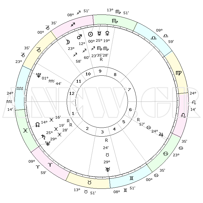 | | ΘΕΣΕΙΣ ΠΛΑΝΗΤΩΝ ΑΣΤΡΟΛΟΓΙΚΟΥ ΧΑΡΤΗ ΤΗΣ ΣΤΙΓΜΗΣ ΑΥΤΗΣ | | | | Πλανήτης | Ζώδιο | Μοίρες | Δεκαήμ. | Σε οίκο | Απόκλιση | | Ακμές των οίκων | | Ηλιος | Τοξότης | 00°20' | Πρώτο | 10 | 20 S 13 | | 1ος | 00°18' | Υδροχόος | | Σελήνη | Τοξότης | 23°21' | Τρίτο | 11 | 28 S 13 | | 2ος | 14°27' | Ιχθείς | | Ερμής | Σκορπιός | 25°39'R | Τρίτο | 10 | 18 S 01 | | 3ος | 22°51' | Κριός | | Αφροδίτη | Σκορπιός | 19°24' | Δεύτερο | 9 | 16 S 37 | | 4ος | 21°16' | Ταύρος | | Αρης | Τοξότης | 12°57' | Δεύτερο | 10 | 22 S 56 | | 5ος | 14°00' | Δίδυμοι | | Δίας | Καρκίνος | 24°58'R | Τρίτο | 6 | 21 N 16 | | 6ος | 05°26' | Καρκίνος | | Κρόνος | Ιχθείς | 25°19'R | Τρίτο | 2 | 04 S 04 | | 7ος | 00°18' | Λέων | | Ουρανός | Ταύρος | 29°24'R | Τρίτο | 4 | 19 N 49 | | 8ος | 14°27' | Παρθένος | | Ποσειδώνας | Ιχθείς | 29°28'R | Τρίτο | 2 | 01 S 28 | | 9ος | 22°51' | Ζυγός | | Πλούτωνας | Υδροχόος | 01°44' | Πρώτο | 1 | 23 S 26 | | 10ος | 21°16' | Σκορπιός | | Β. Δεσμός | Ιχθείς | 14°16' | Δεύτερο | 1 | 06 S 11 | | 11ος | 14°00' | Τοξότης | | Ωροσκόπος | Υδροχόος | 00°18' | Πρώτο | | | 12ος | 05°26' | Αιγόκερως | | Μεσουράνημα | Σκορπιός | 21°16' | Τρίτο | | | |