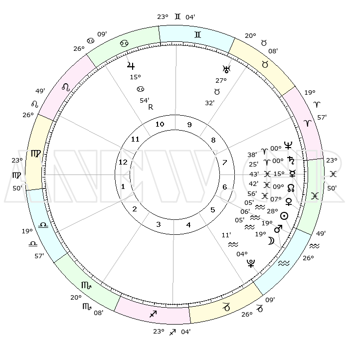 | | ΘΕΣΕΙΣ ΠΛΑΝΗΤΩΝ ΑΣΤΡΟΛΟΓΙΚΟΥ ΧΑΡΤΗ ΤΗΣ ΣΤΙΓΜΗΣ ΑΥΤΗΣ | | | | Πλανήτης | Ζώδιο | Μοίρες | Δεκαήμ. | Σε οίκο | Απόκλιση | | Ακμές των οίκων | | Ηλιος | Υδροχόος | 28°01' | Τρίτο | 6 | 12 S 10 | | 1ος | 03°27' | Παρθένος | | Σελήνη | Υδροχόος | 18°11' | Δεύτερο | 6 | 17 S 09 | | 2ος | 27°40' | Παρθένος | | Ερμής | Ιχθείς | 15°37' | Δεύτερο | 7 | 05 S 16 | | 3ος | 26°38' | Ζυγός | | Αφροδίτη | Ιχθείς | 07°51' | Πρώτο | 7 | 09 S 59 | | 4ος | 29°35' | Σκορπιός | | Αρης | Υδροχόος | 19°03' | Δεύτερο | 6 | 16 S 08 | | 5ος | 03°33' | Αιγόκερως | | Δίας | Καρκίνος | 15°54'R | Δεύτερο | 11 | 22 N 49 | | 6ος | 05°15' | Υδροχόος | | Κρόνος | Κριός | 00°25' | Πρώτο | 8 | 01 S 48 | | 7ος | 03°27' | Ιχθείς | | Ουρανός | Ταύρος | 27°32' | Τρίτο | 9 | 19 N 25 | | 8ος | 27°40' | Ιχθείς | | Ποσειδώνας | Κριός | 00°37' | Πρώτο | 8 | 00 S 57 | | 9ος | 26°38' | Κριός | | Πλούτωνας | Υδροχόος | 04°11' | Πρώτο | 5 | 22 S 56 | | 10ος | 29°35' | Ταύρος | | Β. Δεσμός | Ιχθείς | 09°42' | Πρώτο | 7 | 07 S 56 | | 11ος | 03°33' | Καρκίνος | | Ωροσκόπος | Παρθένος | 03°27' | Πρώτο | | | 12ος | 05°15' | Λέων | | Μεσουράνημα | Ταύρος | 29°35' | Τρίτο | | | |