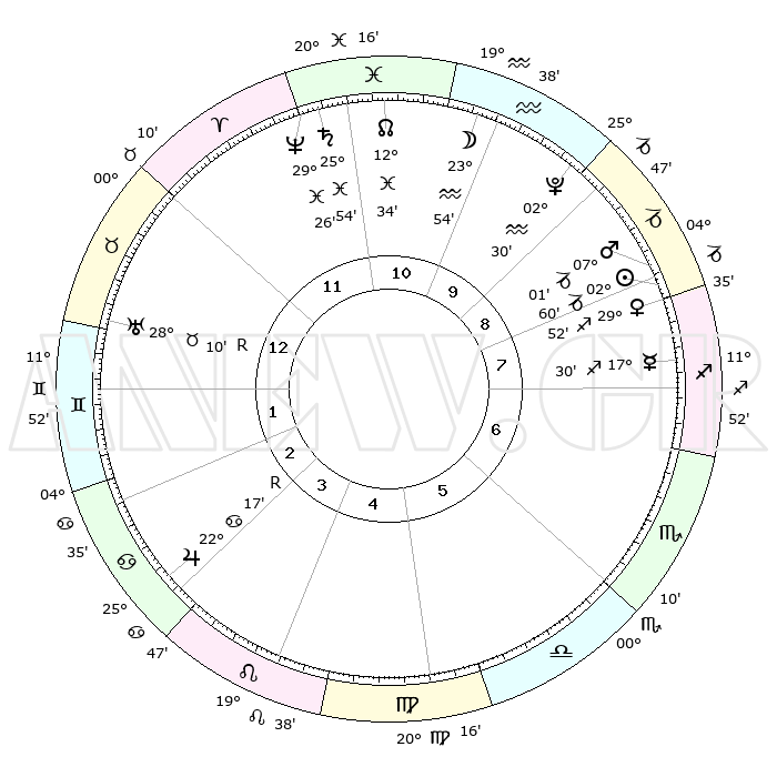 | | ΘΕΣΕΙΣ ΠΛΑΝΗΤΩΝ ΑΣΤΡΟΛΟΓΙΚΟΥ ΧΑΡΤΗ ΤΗΣ ΣΤΙΓΜΗΣ ΑΥΤΗΣ | | | | Πλανήτης | Ζώδιο | Μοίρες | Δεκαήμ. | Σε οίκο | Απόκλιση | | Ακμές των οίκων | | Ηλιος | Αιγόκερως | 02°56' | Πρώτο | 9 | 23 S 24 | | 1ος | 10°31' | Ταύρος | | Σελήνη | Υδροχόος | 22°60' | Τρίτο | 11 | 15 S 21 | | 2ος | 09°54' | Δίδυμοι | | Ερμής | Τοξότης | 17°24' | Δεύτερο | 8 | 22 S 31 | | 3ος | 02°30' | Καρκίνος | | Αφροδίτη | Τοξότης | 29°47' | Τρίτο | 8 | 23 S 39 | | 4ος | 24°19' | Καρκίνος | | Αρης | Αιγόκερως | 06°58' | Πρώτο | 9 | 24 S 05 | | 5ος | 19°54' | Λέων | | Δίας | Καρκίνος | 22°18'R | Τρίτο | 3 | 21 N 48 | | 6ος | 24°43' | Παρθένος | | Κρόνος | Ιχθείς | 25°54' | Τρίτο | 12 | 03 S 44 | | 7ος | 10°32' | Σκορπιός | | Ουρανός | Ταύρος | 28°10'R | Τρίτο | 1 | 19 N 33 | | 8ος | 09°54' | Τοξότης | | Ποσειδώνας | Ιχθείς | 29°26' | Τρίτο | 12 | 01 S 27 | | 9ος | 02°30' | Αιγόκερως | | Πλούτωνας | Υδροχόος | 02°30' | Πρώτο | 10 | 23 S 16 | | 10ος | 24°19' | Αιγόκερως | | Β. Δεσμός | Ιχθείς | 12°34' | Δεύτερο | 11 | 06 S 51 | | 11ος | 19°54' | Υδροχόος | | Ωροσκόπος | Ταύρος | 10°31' | Δεύτερο | | | 12ος | 24°43' | Ιχθείς | | Μεσουράνημα | Αιγόκερως | 24°19' | Τρίτο | | | |