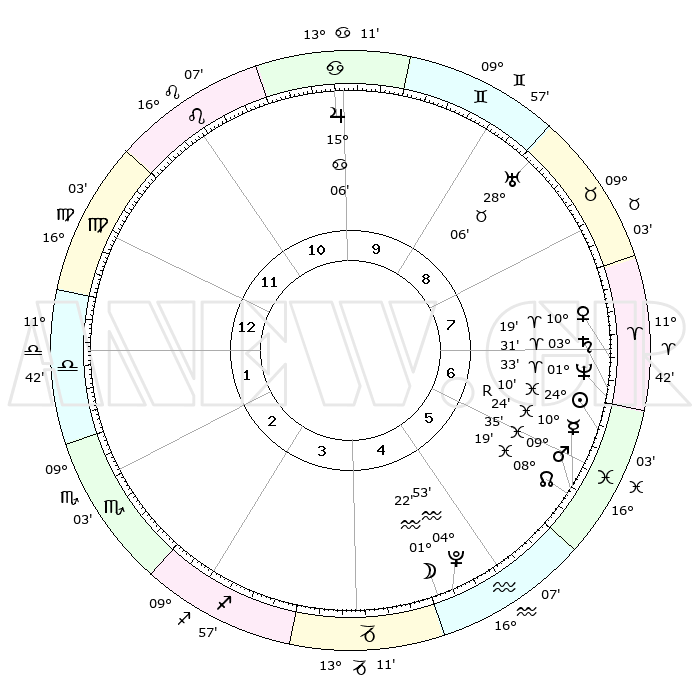 | | ΘΕΣΕΙΣ ΠΛΑΝΗΤΩΝ ΑΣΤΡΟΛΟΓΙΚΟΥ ΧΑΡΤΗ ΤΗΣ ΣΤΙΓΜΗΣ ΑΥΤΗΣ | | | | Πλανήτης | Ζώδιο | Μοίρες | Δεκαήμ. | Σε οίκο | Απόκλιση | | Ακμές των οίκων | | Ηλιος | Ιχθείς | 24°07' | Τρίτο | 6 | 02 S 20 | | 1ος | 25°31' | Παρθένος | | Σελήνη | Υδροχόος | 00°41' | Πρώτο | 5 | 23 S 11 | | 2ος | 21°46' | Ζυγός | | Ερμής | Ιχθείς | 10°26'R | Δεύτερο | 6 | 05 S 21 | | 3ος | 22°02' | Σκορπιός | | Αφροδίτη | Κριός | 10°15' | Δεύτερο | 7 | 03 N 05 | | 4ος | 24°58' | Τοξότης | | Αρης | Ιχθείς | 09°32' | Πρώτο | 6 | 09 S 00 | | 5ος | 28°01' | Αιγόκερως | | Δίας | Καρκίνος | 15°06' | Δεύτερο | 10 | 22 N 56 | | 6ος | 28°37' | Υδροχόος | | Κρόνος | Κριός | 03°30' | Πρώτο | 7 | 00 S 33 | | 7ος | 25°31' | Ιχθείς | | Ουρανός | Ταύρος | 28°06' | Τρίτο | 9 | 19 N 34 | | 8ος | 21°46' | Κριός | | Ποσειδώνας | Κριός | 01°33' | Πρώτο | 7 | 00 S 35 | | 9ος | 22°02' | Ταύρος | | Πλούτωνας | Υδροχόος | 04°53' | Πρώτο | 5 | 22 S 50 | | 10ος | 24°58' | Δίδυμοι | | Β. Δεσμός | Ιχθείς | 08°19' | Πρώτο | 6 | 08 S 27 | | 11ος | 28°01' | Καρκίνος | | Ωροσκόπος | Παρθένος | 25°31' | Τρίτο | | | 12ος | 28°37' | Λέων | | Μεσουράνημα | Δίδυμοι | 24°58' | Τρίτο | | | |