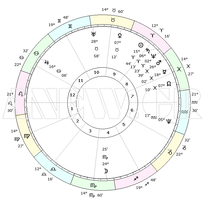 | | ΘΕΣΕΙΣ ΠΛΑΝΗΤΩΝ ΑΣΤΡΟΛΟΓΙΚΟΥ ΧΑΡΤΗ ΤΗΣ ΣΤΙΓΜΗΣ ΑΥΤΗΣ | | | | Πλανήτης | Ζώδιο | Μοίρες | Δεκαήμ. | Σε οίκο | Απόκλιση | | Ακμές των οίκων | | Ηλιος | Κριός | 15°27' | Δεύτερο | 12 | 06 N 05 | | 1ος | 11°35' | Ταύρος | | Σελήνη | Σκορπιός | 20°54' | Τρίτο | 7 | 22 S 43 | | 2ος | 10°41' | Δίδυμοι | | Ερμής | Ιχθείς | 17°43' | Δεύτερο | 11 | 06 S 35 | | 3ος | 03°11' | Καρκίνος | | Αφροδίτη | Ταύρος | 06°51' | Πρώτο | 12 | 13 N 33 | | 4ος | 25°03' | Καρκίνος | | Αρης | Ιχθείς | 26°26' | Τρίτο | 12 | 02 S 22 | | 5ος | 20°45' | Λέων | | Δίας | Καρκίνος | 16°05' | Δεύτερο | 3 | 22 N 50 | | 6ος | 25°47' | Παρθένος | | Κρόνος | Κριός | 06°11' | Πρώτο | 12 | 00 N 30 | | 7ος | 11°35' | Σκορπιός | | Ουρανός | Ταύρος | 28°57' | Τρίτο | 1 | 19 N 45 | | 8ος | 10°41' | Τοξότης | | Ποσειδώνας | Κριός | 02°22' | Πρώτο | 12 | 00 S 16 | | 9ος | 03°11' | Αιγόκερως | | Πλούτωνας | Υδροχόος | 05°17' | Πρώτο | 10 | 22 S 47 | | 10ος | 25°03' | Αιγόκερως | | Β. Δεσμός | Ιχθείς | 07°11' | Πρώτο | 11 | 08 S 52 | | 11ος | 20°45' | Υδροχόος | | Ωροσκόπος | Ταύρος | 11°35' | Δεύτερο | | | 12ος | 25°47' | Ιχθείς | | Μεσουράνημα | Αιγόκερως | 25°03' | Τρίτο | | | |