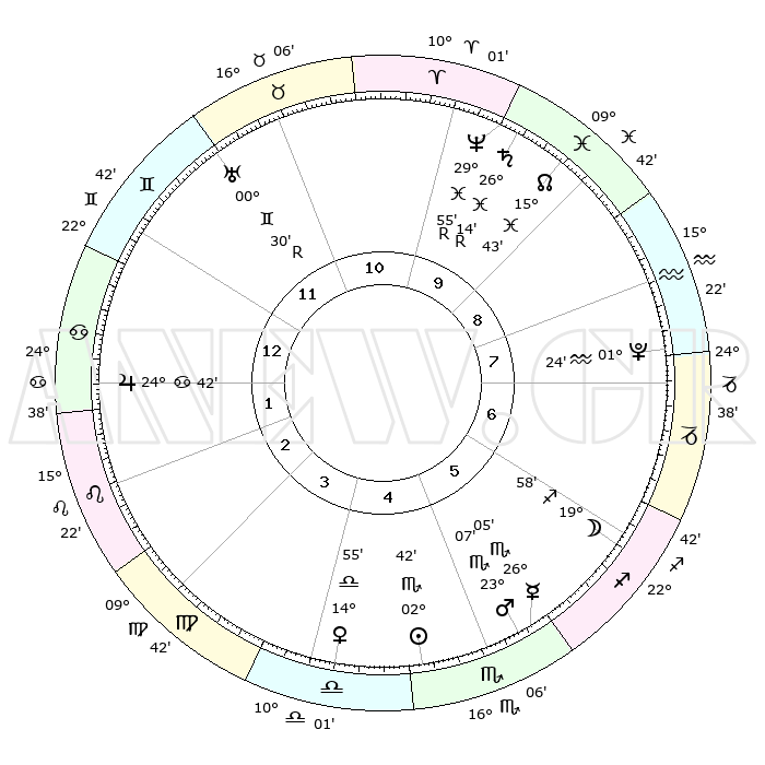 | | ΘΕΣΕΙΣ ΠΛΑΝΗΤΩΝ ΑΣΤΡΟΛΟΓΙΚΟΥ ΧΑΡΤΗ ΤΗΣ ΣΤΙΓΜΗΣ ΑΥΤΗΣ | | | | Πλανήτης | Ζώδιο | Μοίρες | Δεκαήμ. | Σε οίκο | Απόκλιση | | Ακμές των οίκων | | Ηλιος | Σκορπιός | 02°15' | Πρώτο | 9 | 12 S 15 | | 1ος | 11°01' | Αιγόκερως | | Σελήνη | Τοξότης | 14°46' | Δεύτερο | 11 | 27 S 39 | | 2ος | 20°58' | Υδροχόος | | Ερμής | Σκορπιός | 25°34' | Τρίτο | 10 | 21 S 43 | | 3ος | 01°15' | Κριός | | Αφροδίτη | Ζυγός | 14°22' | Δεύτερο | 9 | 04 S 15 | | 4ος | 03°14' | Ταύρος | | Αρης | Σκορπιός | 22°49' | Τρίτο | 10 | 18 S 47 | | 5ος | 27°57' | Ταύρος | | Δίας | Καρκίνος | 24°40' | Τρίτο | 7 | 21 N 15 | | 6ος | 19°15' | Δίδυμοι | | Κρόνος | Ιχθείς | 26°15'R | Τρίτο | 2 | 03 S 46 | | 7ος | 11°01' | Καρκίνος | | Ουρανός | Δίδυμοι | 00°31'R | Πρώτο | 5 | 20 N 03 | | 8ος | 20°58' | Λέων | | Ποσειδώνας | Ιχθείς | 29°56'R | Τρίτο | 2 | 01 S 17 | | 9ος | 01°15' | Ζυγός | | Πλούτωνας | Υδροχόος | 01°24' | Πρώτο | 1 | 23 S 32 | | 10ος | 03°14' | Σκορπιός | | Β. Δεσμός | Ιχθείς | 15°45' | Δεύτερο | 2 | 05 S 37 | | 11ος | 27°57' | Σκορπιός | | Ωροσκόπος | Αιγόκερως | 11°01' | Δεύτερο | | | 12ος | 19°15' | Τοξότης | | Μεσουράνημα | Σκορπιός | 03°14' | Πρώτο | | | |