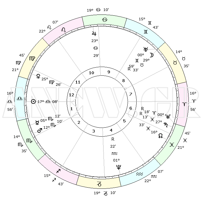| ΘΕΣΕΙΣ ΠΛΑΝΗΤΩΝ ΑΣΤΡΟΛΟΓΙΚΟΥ ΧΑΡΤΗ ΤΗΣ ΣΤΙΓΜΗΣ ΑΥΤΗΣ | | Πλανήτης | Ζώδιο | Μοίρες | Δεκαήμ. | Σε οίκο | Απόκλιση | | Ακμές των οίκων | Ηλιος | Ζυγός | 16°47' | Δεύτερο | 5 | 06 S 36 | | 1ος | 02°24' | Καρκίνος | Σελήνη | Ταύρος | 24°17' | Τρίτο | 11 | 23 N 27 | | 2ος | 23°04' | Καρκίνος | Ερμής | Σκορπιός | 04°41' | Πρώτο | 5 | 14 S 10 | | 3ος | 15°02' | Λέων | Αφροδίτη | Παρθένος | 24°59' | Τρίτο | 4 | 03 N 20 | | 4ος | 11°44' | Παρθένος | Αρης | Σκορπιός | 11°56' | Δεύτερο | 5 | 15 S 34 | | 5ος | 16°02' | Ζυγός | Δίας | Καρκίνος | 23°27' | Τρίτο | 2 | 21 N 26 | | 6ος | 25°51' | Σκορπιός | Κρόνος | Ιχθείς | 27°14'R | Τρίτο | 10 | 03 S 24 | | 7ος | 02°24' | Αιγόκερως | Ουρανός | Δίδυμοι | 01°00'R | Πρώτο | 12 | 20 N 09 | | 8ος | 23°04' | Αιγόκερως | Ποσειδώνας | Κριός | 00°19'R | Πρώτο | 10 | 01 S 08 | | 9ος | 15°02' | Υδροχόος | Πλούτωνας | Υδροχόος | 01°22'R | Πρώτο | 8 | 23 S 32 | | 10ος | 11°44' | Ιχθείς | Β. Δεσμός | Ιχθείς | 16°34' | Δεύτερο | 10 | 05 S 18 | | 11ος | 16°02' | Κριός | Ωροσκόπος | Καρκίνος | 02°24' | Πρώτο | | | 12ος | 25°51' | Ταύρος | Μεσουράνημα | Ιχθείς | 11°44' | Δεύτερο | | | |