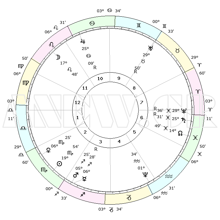 | | ΘΕΣΕΙΣ ΠΛΑΝΗΤΩΝ ΑΣΤΡΟΛΟΓΙΚΟΥ ΧΑΡΤΗ ΤΗΣ ΣΤΙΓΜΗΣ ΑΥΤΗΣ | | | | Πλανήτης | Ζώδιο | Μοίρες | Δεκαήμ. | Σε οίκο | Απόκλιση | | Ακμές των οίκων | | Ηλιος | Σκορπιός | 19°50' | Δεύτερο | 3 | 17 S 42 | | 1ος | 14°09' | Παρθένος | | Σελήνη | Λέων | 16°57' | Δεύτερο | 12 | 18 N 07 | | 2ος | 09°25' | Ζυγός | | Ερμής | Τοξότης | 06°30'R | Πρώτο | 3 | 23 S 19 | | 3ος | 09°08' | Σκορπιός | | Αφροδίτη | Σκορπιός | 06°20' | Πρώτο | 2 | 12 S 25 | | 4ος | 12°04' | Τοξότης | | Αρης | Τοξότης | 05°22' | Πρώτο | 3 | 21 S 41 | | 5ος | 15°28' | Αιγόκερως | | Δίας | Καρκίνος | 25°09'R | Τρίτο | 11 | 21 N 12 | | 6ος | 16°33' | Υδροχόος | | Κρόνος | Ιχθείς | 25°31'R | Τρίτο | 7 | 04 S 01 | | 7ος | 14°09' | Ιχθείς | | Ουρανός | Ταύρος | 29°50'R | Τρίτο | 9 | 19 N 54 | | 8ος | 09°25' | Κριός | | Ποσειδώνας | Ιχθείς | 29°36'R | Τρίτο | 7 | 01 S 25 | | 9ος | 09°08' | Ταύρος | | Πλούτωνας | Υδροχόος | 01°34' | Πρώτο | 5 | 23 S 29 | | 10ος | 12°04' | Δίδυμοι | | Β. Δεσμός | Ιχθείς | 14°49' | Δεύτερο | 7 | 05 S 59 | | 11ος | 15°28' | Καρκίνος | | Ωροσκόπος | Παρθένος | 14°09' | Δεύτερο | | | 12ος | 16°33' | Λέων | | Μεσουράνημα | Δίδυμοι | 12°04' | Δεύτερο | | | |
