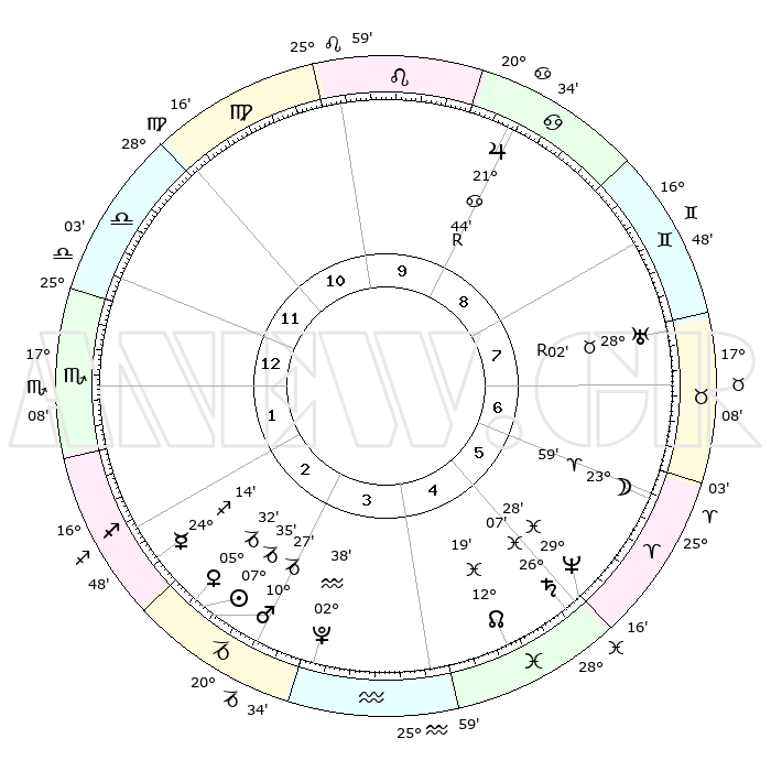 | | ΘΕΣΕΙΣ ΠΛΑΝΗΤΩΝ ΑΣΤΡΟΛΟΓΙΚΟΥ ΧΑΡΤΗ ΤΗΣ ΣΤΙΓΜΗΣ ΑΥΤΗΣ | | | | Πλανήτης | Ζώδιο | Μοίρες | Δεκαήμ. | Σε οίκο | Απόκλιση | | Ακμές των οίκων | | Ηλιος | Αιγόκερως | 07°31' | Πρώτο | 3 | 23 S 13 | | 1ος | 26°11' | Ζυγός | | Σελήνη | Κριός | 22°58' | Τρίτο | 6 | 12 N 04 | | 2ος | 24°22' | Σκορπιός | | Ερμής | Τοξότης | 24°07' | Τρίτο | 2 | 23 S 32 | | 3ος | 26°03' | Τοξότης | | Αφροδίτη | Αιγόκερως | 05°27' | Πρώτο | 3 | 23 S 43 | | 4ος | 29°59' | Αιγόκερως | | Αρης | Αιγόκερως | 10°24' | Δεύτερο | 3 | 23 S 54 | | 5ος | 02°56' | Ιχθείς | | Δίας | Καρκίνος | 21°44'R | Τρίτο | 9 | 21 N 54 | | 6ος | 01°56' | Κριός | | Κρόνος | Ιχθείς | 26°07' | Τρίτο | 5 | 03 S 38 | | 7ος | 26°11' | Κριός | | Ουρανός | Ταύρος | 28°02'R | Τρίτο | 8 | 19 N 31 | | 8ος | 24°22' | Ταύρος | | Ποσειδώνας | Ιχθείς | 29°28' | Τρίτο | 5 | 01 S 26 | | 9ος | 26°03' | Δίδυμοι | | Πλούτωνας | Υδροχόος | 02°38' | Πρώτο | 4 | 23 S 14 | | 10ος | 29°59' | Καρκίνος | | Β. Δεσμός | Ιχθείς | 12°20' | Δεύτερο | 5 | 06 S 56 | | 11ος | 02°56' | Παρθένος | | Ωροσκόπος | Ζυγός | 26°11' | Τρίτο | | | 12ος | 01°56' | Ζυγός | | Μεσουράνημα | Καρκίνος | 29°59' | Τρίτο | | | |