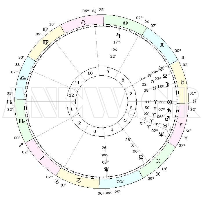 | | ΘΕΣΕΙΣ ΠΛΑΝΗΤΩΝ ΑΣΤΡΟΛΟΓΙΚΟΥ ΧΑΡΤΗ ΤΗΣ ΣΤΙΓΜΗΣ ΑΥΤΗΣ | | | | Πλανήτης | Ζώδιο | Μοίρες | Δεκαήμ. | Σε οίκο | Απόκλιση | | Ακμές των οίκων | | Ηλιος | Κριός | 28°38' | Τρίτο | 7 | 10 N 59 | | 1ος | 13°03' | Ζυγός | | Σελήνη | Ταύρος | 14°41' | Δεύτερο | 8 | 20 N 44 | | 2ος | 10°29' | Σκορπιός | | Ερμής | Κριός | 05°08' | Πρώτο | 6 | 00 S 23 | | 3ος | 11°26' | Τοξότης | | Αφροδίτη | Ταύρος | 23°17' | Τρίτο | 8 | 18 N 55 | | 4ος | 14°43' | Αιγόκερως | | Αρης | Κριός | 06°52' | Πρώτο | 6 | 01 N 51 | | 5ος | 17°39' | Υδροχόος | | Δίας | Καρκίνος | 17°22' | Δεύτερο | 10 | 22 N 41 | | 6ος | 17°31' | Ιχθείς | | Κρόνος | Κριός | 07°49' | Πρώτο | 6 | 01 N 08 | | 7ος | 13°03' | Κριός | | Ουρανός | Ταύρος | 29°37' | Τρίτο | 8 | 19 N 54 | | 8ος | 10°29' | Ταύρος | | Ποσειδώνας | Κριός | 02°51' | Πρώτο | 6 | 00 S 04 | | 9ος | 11°26' | Δίδυμοι | | Πλούτωνας | Υδροχόος | 05°26' | Πρώτο | 4 | 22 S 47 | | 10ος | 14°43' | Καρκίνος | | Β. Δεσμός | Ιχθείς | 06°28' | Πρώτο | 5 | 09 S 08 | | 11ος | 17°39' | Λέων | | Ωροσκόπος | Ζυγός | 13°03' | Δεύτερο | | | 12ος | 17°31' | Παρθένος | | Μεσουράνημα | Καρκίνος | 14°43' | Δεύτερο | | | |