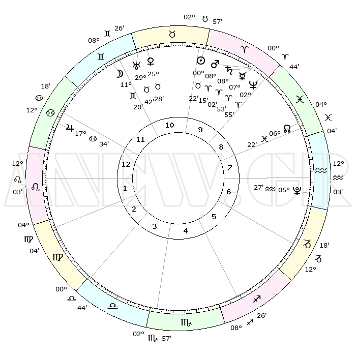 | | ΘΕΣΕΙΣ ΠΛΑΝΗΤΩΝ ΑΣΤΡΟΛΟΓΙΚΟΥ ΧΑΡΤΗ ΤΗΣ ΣΤΙΓΜΗΣ ΑΥΤΗΣ | | | | Πλανήτης | Ζώδιο | Μοίρες | Δεκαήμ. | Σε οίκο | Απόκλιση | | Ακμές των οίκων | | Ηλιος | Ταύρος | 00°18' | Πρώτο | 10 | 11 N 35 | | 1ος | 23°36' | Καρκίνος | | Σελήνη | Δίδυμοι | 10°24' | Δεύτερο | 11 | 27 N 02 | | 2ος | 14°16' | Λέων | | Ερμής | Κριός | 07°47' | Πρώτο | 9 | 00 N 41 | | 3ος | 08°28' | Παρθένος | | Αφροδίτη | Ταύρος | 25°24' | Τρίτο | 11 | 19 N 31 | | 4ος | 08°38' | Ζυγός | | Αρης | Κριός | 08°12' | Πρώτο | 9 | 02 N 23 | | 5ος | 14°43' | Σκορπιός | | Δίας | Καρκίνος | 17°33' | Δεύτερο | 12 | 22 N 40 | | 6ος | 21°30' | Τοξότης | | Κρόνος | Κριός | 08°02' | Πρώτο | 9 | 01 N 12 | | 7ος | 23°36' | Αιγόκερως | | Ουρανός | Ταύρος | 29°42' | Τρίτο | 11 | 19 N 55 | | 8ος | 14°16' | Υδροχόος | | Ποσειδώνας | Κριός | 02°55' | Πρώτο | 9 | 00 S 03 | | 9ος | 08°28' | Ιχθείς | | Πλούτωνας | Υδροχόος | 05°27' | Πρώτο | 7 | 22 S 48 | | 10ος | 08°38' | Κριός | | Β. Δεσμός | Ιχθείς | 06°23' | Πρώτο | 8 | 09 S 10 | | 11ος | 14°43' | Ταύρος | | Ωροσκόπος | Καρκίνος | 23°36' | Τρίτο | | | 12ος | 21°30' | Δίδυμοι | | Μεσουράνημα | Κριός | 08°38' | Πρώτο | | | |