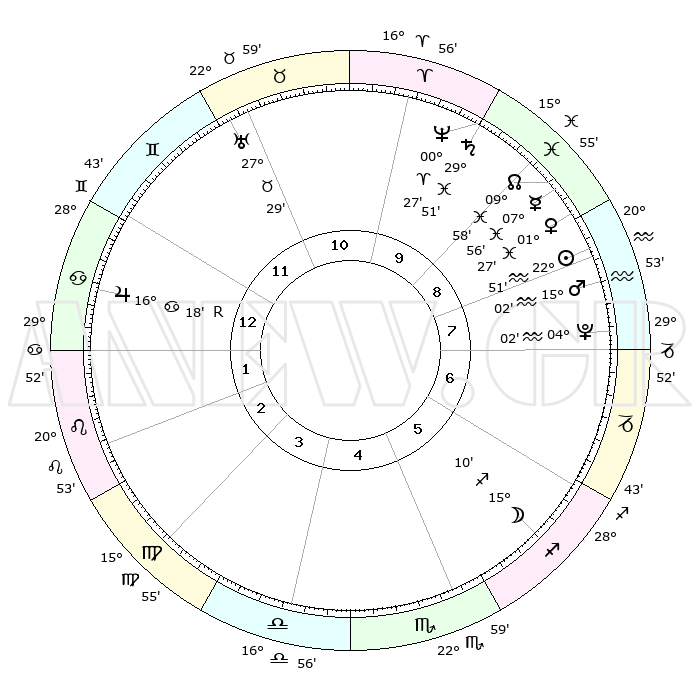 | | ΘΕΣΕΙΣ ΠΛΑΝΗΤΩΝ ΑΣΤΡΟΛΟΓΙΚΟΥ ΧΑΡΤΗ ΤΗΣ ΣΤΙΓΜΗΣ ΑΥΤΗΣ | | | | Πλανήτης | Ζώδιο | Μοίρες | Δεκαήμ. | Σε οίκο | Απόκλιση | | Ακμές των οίκων | | Ηλιος | Υδροχόος | 22°47' | Τρίτο | 9 | 13 S 55 | | 1ος | 08°04' | Καρκίνος | | Σελήνη | Τοξότης | 14°18' | Δεύτερο | 6 | 27 S 43 | | 2ος | 28°32' | Καρκίνος | | Ερμής | Ιχθείς | 07°49' | Πρώτο | 9 | 09 S 14 | | 3ος | 20°59' | Λέων | | Αφροδίτη | Ιχθείς | 01°22' | Πρώτο | 9 | 12 S 21 | | 4ος | 18°37' | Παρθένος | | Αρης | Υδροχόος | 14°59' | Δεύτερο | 8 | 17 S 22 | | 5ος | 23°41' | Ζυγός | | Δίας | Καρκίνος | 16°19'R | Δεύτερο | 1 | 22 N 45 | | 6ος | 02°53' | Τοξότης | | Κρόνος | Ιχθείς | 29°51' | Τρίτο | 10 | 02 S 02 | | 7ος | 08°04' | Αιγόκερως | | Ουρανός | Ταύρος | 27°29' | Τρίτο | 11 | 19 N 25 | | 8ος | 28°32' | Αιγόκερως | | Ποσειδώνας | Κριός | 00°27' | Πρώτο | 10 | 01 S 01 | | 9ος | 20°59' | Υδροχόος | | Πλούτωνας | Υδροχόος | 04°02' | Πρώτο | 8 | 22 S 58 | | 10ος | 18°37' | Ιχθείς | | Β. Δεσμός | Ιχθείς | 09°58' | Πρώτο | 9 | 07 S 50 | | 11ος | 23°41' | Κριός | | Ωροσκόπος | Καρκίνος | 08°04' | Πρώτο | | | 12ος | 02°53' | Δίδυμοι | | Μεσουράνημα | Ιχθείς | 18°37' | Δεύτερο | | | |