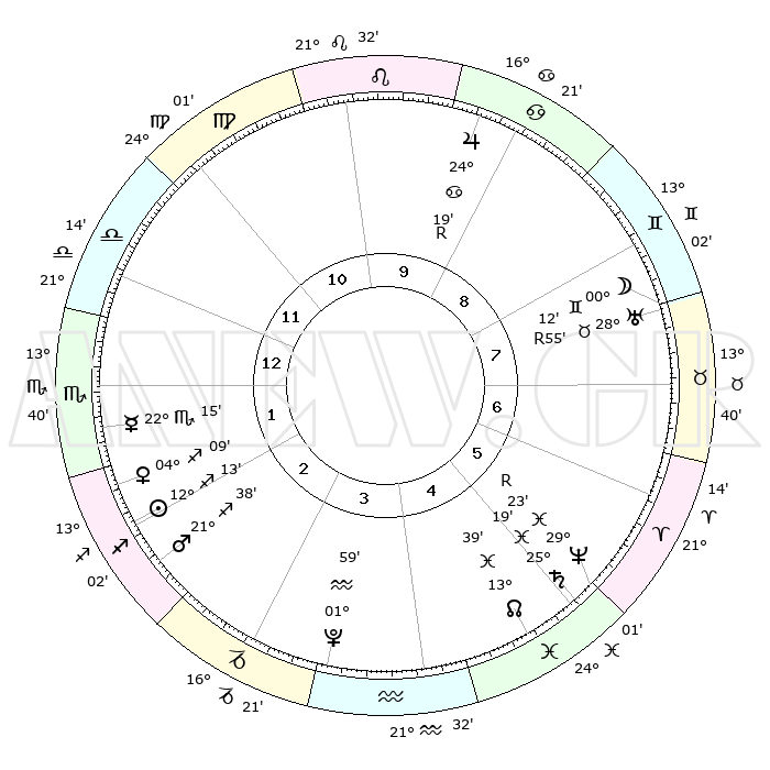 | | ΘΕΣΕΙΣ ΠΛΑΝΗΤΩΝ ΑΣΤΡΟΛΟΓΙΚΟΥ ΧΑΡΤΗ ΤΗΣ ΣΤΙΓΜΗΣ ΑΥΤΗΣ | | | | Πλανήτης | Ζώδιο | Μοίρες | Δεκαήμ. | Σε οίκο | Απόκλιση | | Ακμές των οίκων | | Ηλιος | Τοξότης | 12°09' | Δεύτερο | 2 | 22 S 15 | | 1ος | 24°54' | Ζυγός | | Σελήνη | Ταύρος | 29°13' | Τρίτο | 8 | 24 N 42 | | 2ος | 23°01' | Σκορπιός | | Ερμής | Σκορπιός | 22°13' | Τρίτο | 1 | 15 S 49 | | 3ος | 24°37' | Τοξότης | | Αφροδίτη | Τοξότης | 04°04' | Πρώτο | 2 | 20 S 22 | | 4ος | 28°28' | Αιγόκερως | | Αρης | Τοξότης | 21°35' | Τρίτο | 2 | 23 S 51 | | 5ος | 01°26' | Ιχθείς | | Δίας | Καρκίνος | 24°19'R | Τρίτο | 9 | 21 N 25 | | 6ος | 00°32' | Κριός | | Κρόνος | Ιχθείς | 25°19' | Τρίτο | 5 | 04 S 02 | | 7ος | 24°54' | Κριός | | Ουρανός | Ταύρος | 28°55'R | Τρίτο | 8 | 19 N 43 | | 8ος | 23°01' | Ταύρος | | Ποσειδώνας | Ιχθείς | 29°23'R | Τρίτο | 5 | 01 S 29 | | 9ος | 24°37' | Δίδυμοι | | Πλούτωνας | Υδροχόος | 01°58' | Πρώτο | 4 | 23 S 23 | | 10ος | 28°28' | Καρκίνος | | Β. Δεσμός | Ιχθείς | 13°39' | Δεύτερο | 5 | 06 S 26 | | 11ος | 01°26' | Παρθένος | | Ωροσκόπος | Ζυγός | 24°54' | Τρίτο | | | 12ος | 00°32' | Ζυγός | | Μεσουράνημα | Καρκίνος | 28°28' | Τρίτο | | | |