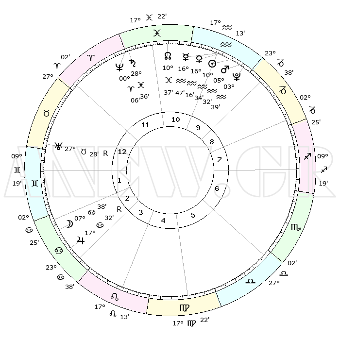 | | ΘΕΣΕΙΣ ΠΛΑΝΗΤΩΝ ΑΣΤΡΟΛΟΓΙΚΟΥ ΧΑΡΤΗ ΤΗΣ ΣΤΙΓΜΗΣ ΑΥΤΗΣ | | | | Πλανήτης | Ζώδιο | Μοίρες | Δεκαήμ. | Σε οίκο | Απόκλιση | | Ακμές των οίκων | | Ηλιος | Υδροχόος | 10°31' | Δεύτερο | 10 | 17 S 36 | | 1ος | 14°48' | Ταύρος | | Σελήνη | Καρκίνος | 06°49' | Πρώτο | 3 | 27 N 52 | | 2ος | 13°05' | Δίδυμοι | | Ερμής | Υδροχόος | 16°41' | Δεύτερο | 10 | 17 S 42 | | 3ος | 05°20' | Καρκίνος | | Αφροδίτη | Υδροχόος | 16°11' | Δεύτερο | 10 | 17 S 15 | | 4ος | 27°18' | Καρκίνος | | Αρης | Υδροχόος | 05°29' | Πρώτο | 10 | 19 S 54 | | 5ος | 23°25' | Λέων | | Δίας | Καρκίνος | 17°32'R | Δεύτερο | 3 | 22 N 35 | | 6ος | 29°06' | Παρθένος | | Κρόνος | Ιχθείς | 28°36' | Τρίτο | 11 | 02 S 33 | | 7ος | 14°48' | Σκορπιός | | Ουρανός | Ταύρος | 27°28'R | Τρίτο | 1 | 19 N 24 | | 8ος | 13°05' | Τοξότης | | Ποσειδώνας | Κριός | 00°06' | Πρώτο | 12 | 01 S 10 | | 9ος | 05°20' | Αιγόκερως | | Πλούτωνας | Υδροχόος | 03°39' | Πρώτο | 10 | 23 S 02 | | 10ος | 27°18' | Αιγόκερως | | Β. Δεσμός | Ιχθείς | 10°37' | Δεύτερο | 11 | 07 S 35 | | 11ος | 23°25' | Υδροχόος | | Ωροσκόπος | Ταύρος | 14°48' | Δεύτερο | | | 12ος | 29°06' | Ιχθείς | | Μεσουράνημα | Αιγόκερως | 27°18' | Τρίτο | | | |