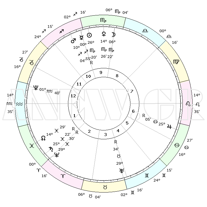 | | ΘΕΣΕΙΣ ΠΛΑΝΗΤΩΝ ΑΣΤΡΟΛΟΓΙΚΟΥ ΧΑΡΤΗ ΤΗΣ ΣΤΙΓΜΗΣ ΑΥΤΗΣ | | | | Πλανήτης | Ζώδιο | Μοίρες | Δεκαήμ. | Σε οίκο | Απόκλιση | | Ακμές των οίκων | | Ηλιος | Σκορπιός | 26°16' | Τρίτο | 10 | 19 S 19 | | 1ος | 14°55' | Αιγόκερως | | Σελήνη | Σκορπιός | 05°32' | Πρώτο | 9 | 16 S 58 | | 2ος | 25°51' | Υδροχόος | | Ερμής | Τοξότης | 01°00'R | Πρώτο | 10 | 20 S 30 | | 3ος | 05°58' | Κριός | | Αφροδίτη | Σκορπιός | 14°21' | Δεύτερο | 10 | 15 S 04 | | 4ος | 07°13' | Ταύρος | | Αρης | Τοξότης | 10°01' | Δεύτερο | 11 | 22 S 30 | | 5ος | 01°26' | Δίδυμοι | | Δίας | Καρκίνος | 25°05'R | Τρίτο | 7 | 21 N 14 | | 6ος | 22°40' | Δίδυμοι | | Κρόνος | Ιχθείς | 25°22'R | Τρίτο | 2 | 04 S 03 | | 7ος | 14°55' | Καρκίνος | | Ουρανός | Ταύρος | 29°34'R | Τρίτο | 4 | 19 N 51 | | 8ος | 25°51' | Λέων | | Ποσειδώνας | Ιχθείς | 29°30'R | Τρίτο | 2 | 01 S 27 | | 9ος | 05°58' | Ζυγός | | Πλούτωνας | Υδροχόος | 01°40' | Πρώτο | 1 | 23 S 27 | | 10ος | 07°13' | Σκορπιός | | Β. Δεσμός | Ιχθείς | 14°29' | Δεύτερο | 2 | 06 S 06 | | 11ος | 01°26' | Τοξότης | | Ωροσκόπος | Αιγόκερως | 14°55' | Δεύτερο | | | 12ος | 22°40' | Τοξότης | | Μεσουράνημα | Σκορπιός | 07°13' | Πρώτο | | | |