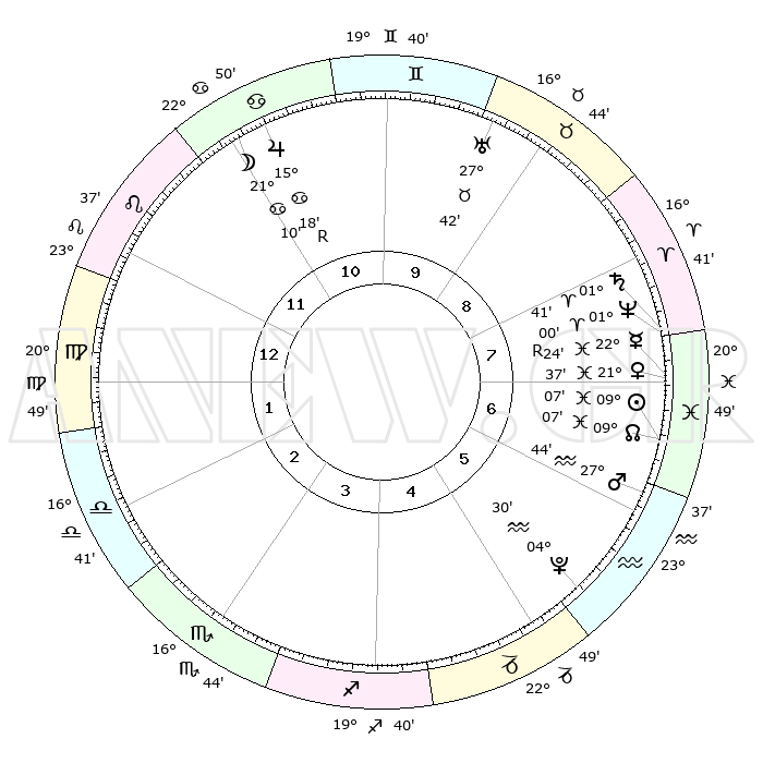 | | ΘΕΣΕΙΣ ΠΛΑΝΗΤΩΝ ΑΣΤΡΟΛΟΓΙΚΟΥ ΧΑΡΤΗ ΤΗΣ ΣΤΙΓΜΗΣ ΑΥΤΗΣ | | | | Πλανήτης | Ζώδιο | Μοίρες | Δεκαήμ. | Σε οίκο | Απόκλιση | | Ακμές των οίκων | | Ηλιος | Ιχθείς | 09°03' | Πρώτο | 7 | 08 S 10 | | 1ος | 02°05' | Παρθένος | | Σελήνη | Καρκίνος | 20°17' | Τρίτο | 11 | 25 N 50 | | 2ος | 26°10' | Παρθένος | | Ερμής | Ιχθείς | 22°25'R | Τρίτο | 7 | 00 S 12 | | 3ος | 25°01' | Ζυγός | | Αφροδίτη | Ιχθείς | 21°33' | Τρίτο | 7 | 04 S 37 | | 4ος | 27°57' | Σκορπιός | | Αρης | Υδροχόος | 27°41' | Τρίτο | 6 | 13 S 18 | | 5ος | 02°00' | Αιγόκερως | | Δίας | Καρκίνος | 15°18'R | Δεύτερο | 11 | 22 N 54 | | 6ος | 03°48' | Υδροχόος | | Κρόνος | Κριός | 01°41' | Πρώτο | 8 | 01 S 17 | | 7ος | 02°05' | Ιχθείς | | Ουρανός | Ταύρος | 27°42' | Τρίτο | 9 | 19 N 28 | | 8ος | 26°10' | Ιχθείς | | Ποσειδώνας | Κριός | 01°00' | Πρώτο | 8 | 00 S 48 | | 9ος | 25°01' | Κριός | | Πλούτωνας | Υδροχόος | 04°30' | Πρώτο | 6 | 22 S 53 | | 10ος | 27°57' | Ταύρος | | Β. Δεσμός | Ιχθείς | 09°07' | Πρώτο | 7 | 08 S 09 | | 11ος | 02°00' | Καρκίνος | | Ωροσκόπος | Παρθένος | 02°05' | Πρώτο | | | 12ος | 03°48' | Λέων | | Μεσουράνημα | Ταύρος | 27°57' | Τρίτο | | | |