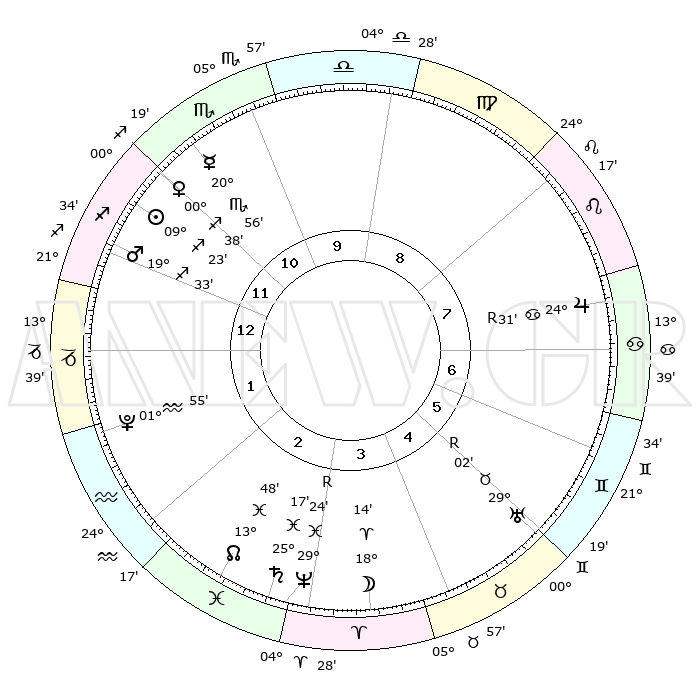 | | ΘΕΣΕΙΣ ΠΛΑΝΗΤΩΝ ΑΣΤΡΟΛΟΓΙΚΟΥ ΧΑΡΤΗ ΤΗΣ ΣΤΙΓΜΗΣ ΑΥΤΗΣ | | | | Πλανήτης | Ζώδιο | Μοίρες | Δεκαήμ. | Σε οίκο | Απόκλιση | | Ακμές των οίκων | | Ηλιος | Τοξότης | 09°21' | Πρώτο | 11 | 21 S 51 | | 1ος | 04°19' | Αιγόκερως | | Σελήνη | Κριός | 17°51' | Δεύτερο | 3 | 09 N 35 | | 2ος | 12°34' | Υδροχόος | | Ερμής | Σκορπιός | 20°55' | Τρίτο | 10 | 15 S 28 | | 3ος | 22°48' | Ιχθείς | | Αφροδίτη | Τοξότης | 00°36' | Πρώτο | 11 | 19 S 35 | | 4ος | 26°01' | Κριός | | Αρης | Τοξότης | 19°32' | Δεύτερο | 12 | 23 S 41 | | 5ος | 21°40' | Ταύρος | | Δίας | Καρκίνος | 24°31'R | Τρίτο | 7 | 21 N 22 | | 6ος | 13°13' | Δίδυμοι | | Κρόνος | Ιχθείς | 25°17' | Τρίτο | 3 | 04 S 03 | | 7ος | 04°19' | Καρκίνος | | Ουρανός | Ταύρος | 29°02'R | Τρίτο | 5 | 19 N 44 | | 8ος | 12°34' | Λέων | | Ποσειδώνας | Ιχθείς | 29°24'R | Τρίτο | 3 | 01 S 29 | | 9ος | 22°48' | Παρθένος | | Πλούτωνας | Υδροχόος | 01°55' | Πρώτο | 1 | 23 S 24 | | 10ος | 26°01' | Ζυγός | | Β. Δεσμός | Ιχθείς | 13°48' | Δεύτερο | 2 | 06 S 22 | | 11ος | 21°40' | Σκορπιός | | Ωροσκόπος | Αιγόκερως | 04°19' | Πρώτο | | | 12ος | 13°13' | Τοξότης | | Μεσουράνημα | Ζυγός | 26°01' | Τρίτο | | | |