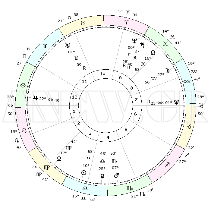 | ΘΕΣΕΙΣ ΠΛΑΝΗΤΩΝ ΑΣΤΡΟΛΟΓΙΚΟΥ ΧΑΡΤΗ ΤΗΣ ΣΤΙΓΜΗΣ ΑΥΤΗΣ | | Πλανήτης | Ζώδιο | Μοίρες | Δεκαήμ. | Σε οίκο | Απόκλιση | | Ακμές των οίκων | Ηλιος | Ζυγός | 10°54' | Δεύτερο | 4 | 04 S 19 | | 1ος | 09°22' | Καρκίνος | Σελήνη | Υδροχόος | 27°03' | Τρίτο | 9 | 14 S 17 | | 2ος | 29°49' | Καρκίνος | Ερμής | Ζυγός | 25°42' | Τρίτο | 5 | 10 S 21 | | 3ος | 22°22' | Λέων | Αφροδίτη | Παρθένος | 17°37' | Δεύτερο | 3 | 06 N 08 | | 4ος | 20°14' | Παρθένος | Αρης | Σκορπιός | 07°50' | Πρώτο | 5 | 14 S 13 | | 5ος | 25°27' | Ζυγός | Δίας | Καρκίνος | 22°48' | Τρίτο | 1 | 21 N 32 | | 6ος | 04°28' | Τοξότης | Κρόνος | Ιχθείς | 27°40'R | Τρίτο | 10 | 03 S 14 | | 7ος | 09°22' | Αιγόκερως | Ουρανός | Δίδυμοι | 01°09'R | Πρώτο | 11 | 20 N 11 | | 8ος | 29°49' | Αιγόκερως | Ποσειδώνας | Κριός | 00°28'R | Πρώτο | 10 | 01 S 05 | | 9ος | 22°22' | Υδροχόος | Πλούτωνας | Υδροχόος | 01°23'R | Πρώτο | 8 | 23 S 32 | | 10ος | 20°14' | Ιχθείς | Β. Δεσμός | Ιχθείς | 16°53' | Δεύτερο | 9 | 05 S 11 | | 11ος | 25°27' | Κριός | Ωροσκόπος | Καρκίνος | 09°22' | Πρώτο | | | 12ος | 04°28' | Δίδυμοι | Μεσουράνημα | Ιχθείς | 20°14' | Τρίτο | | | |