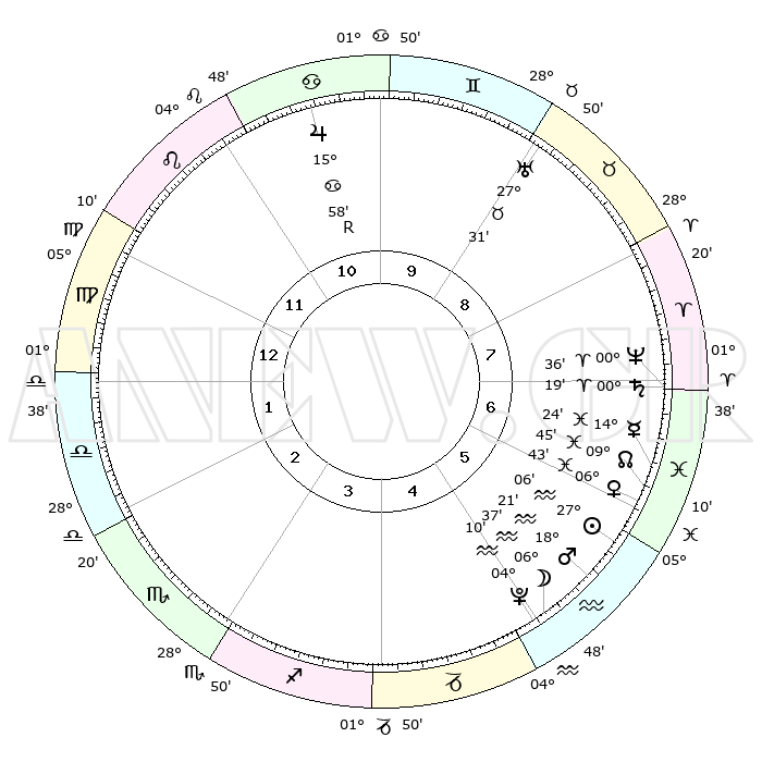 | | ΘΕΣΕΙΣ ΠΛΑΝΗΤΩΝ ΑΣΤΡΟΛΟΓΙΚΟΥ ΧΑΡΤΗ ΤΗΣ ΣΤΙΓΜΗΣ ΑΥΤΗΣ | | | | Πλανήτης | Ζώδιο | Μοίρες | Δεκαήμ. | Σε οίκο | Απόκλιση | | Ακμές των οίκων | | Ηλιος | Υδροχόος | 27°03' | Τρίτο | 6 | 12 S 30 | | 1ος | 14°39' | Παρθένος | | Σελήνη | Υδροχόος | 05°53' | Πρώτο | 5 | 21 S 35 | | 2ος | 09°58' | Ζυγός | | Ερμής | Ιχθείς | 14°19' | Δεύτερο | 6 | 05 S 59 | | 3ος | 09°42' | Σκορπιός | | Αφροδίτη | Ιχθείς | 06°39' | Πρώτο | 6 | 10 S 26 | | 4ος | 12°39' | Τοξότης | | Αρης | Υδροχόος | 18°18' | Δεύτερο | 6 | 16 S 22 | | 5ος | 16°01' | Αιγόκερως | | Δίας | Καρκίνος | 15°58'R | Δεύτερο | 10 | 22 N 48 | | 6ος | 17°05' | Υδροχόος | | Κρόνος | Κριός | 00°18' | Πρώτο | 7 | 01 S 51 | | 7ος | 14°39' | Ιχθείς | | Ουρανός | Ταύρος | 27°31' | Τρίτο | 9 | 19 N 25 | | 8ος | 09°58' | Κριός | | Ποσειδώνας | Κριός | 00°35' | Πρώτο | 7 | 00 S 58 | | 9ος | 09°42' | Ταύρος | | Πλούτωνας | Υδροχόος | 04°09' | Πρώτο | 5 | 22 S 56 | | 10ος | 12°39' | Δίδυμοι | | Β. Δεσμός | Ιχθείς | 09°45' | Πρώτο | 6 | 07 S 55 | | 11ος | 16°01' | Καρκίνος | | Ωροσκόπος | Παρθένος | 14°39' | Δεύτερο | | | 12ος | 17°05' | Λέων | | Μεσουράνημα | Δίδυμοι | 12°39' | Δεύτερο | | | |