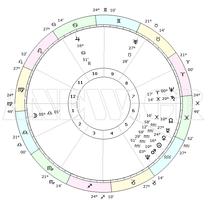 | | ΘΕΣΕΙΣ ΠΛΑΝΗΤΩΝ ΑΣΤΡΟΛΟΓΙΚΟΥ ΧΑΡΤΗ ΤΗΣ ΣΤΙΓΜΗΣ ΑΥΤΗΣ | | | | Πλανήτης | Ζώδιο | Μοίρες | Δεκαήμ. | Σε οίκο | Απόκλιση | | Ακμές των οίκων | | Ηλιος | Υδροχόος | 16°54' | Δεύτερο | 6 | 15 S 46 | | 1ος | 01°23' | Παρθένος | | Σελήνη | Ζυγός | 04°00' | Πρώτο | 2 | 03 S 37 | | 2ος | 25°23' | Παρθένος | | Ερμής | Υδροχόος | 27°50' | Τρίτο | 6 | 13 S 37 | | 3ος | 24°11' | Ζυγός | | Αφροδίτη | Υδροχόος | 24°06' | Τρίτο | 6 | 14 S 50 | | 4ος | 27°06' | Σκορπιός | | Αρης | Υδροχόος | 10°26' | Δεύτερο | 6 | 18 S 38 | | 5ος | 01°12' | Αιγόκερως | | Δίας | Καρκίνος | 16°51'R | Δεύτερο | 11 | 22 N 41 | | 6ος | 03°03' | Υδροχόος | | Κρόνος | Ιχθείς | 29°14' | Τρίτο | 8 | 02 S 18 | | 7ος | 01°23' | Ιχθείς | | Ουρανός | Ταύρος | 27°27' | Τρίτο | 10 | 19 N 24 | | 8ος | 25°23' | Ιχθείς | | Ποσειδώνας | Κριός | 00°17' | Πρώτο | 8 | 01 S 06 | | 9ος | 24°11' | Κριός | | Πλούτωνας | Υδροχόος | 03°51' | Πρώτο | 6 | 23 S 00 | | 10ος | 27°06' | Ταύρος | | Β. Δεσμός | Ιχθείς | 10°17' | Δεύτερο | 7 | 07 S 43 | | 11ος | 01°12' | Καρκίνος | | Ωροσκόπος | Παρθένος | 01°23' | Πρώτο | | | 12ος | 03°03' | Λέων | | Μεσουράνημα | Ταύρος | 27°06' | Τρίτο | | | |