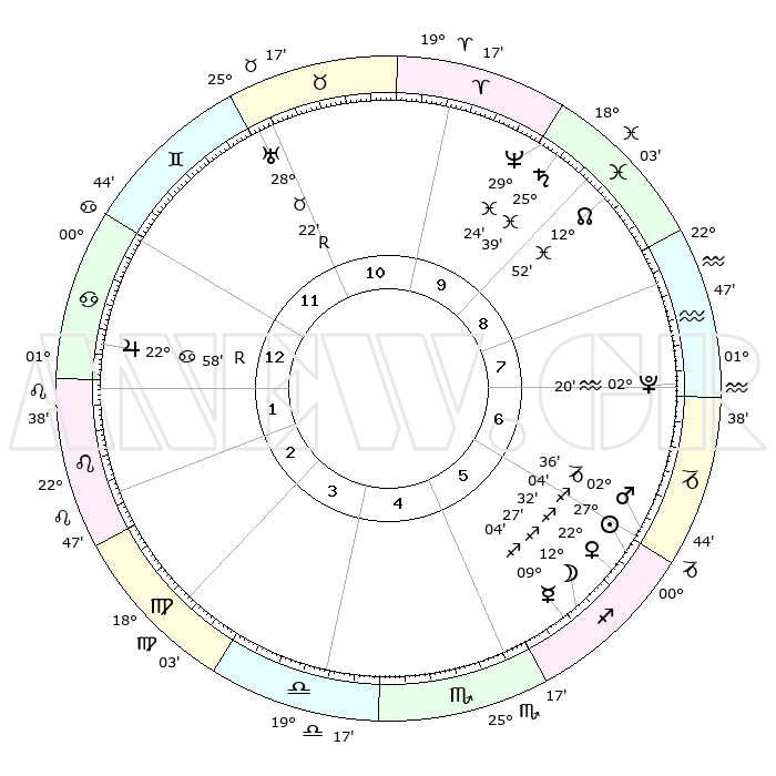 | | ΘΕΣΕΙΣ ΠΛΑΝΗΤΩΝ ΑΣΤΡΟΛΟΓΙΚΟΥ ΧΑΡΤΗ ΤΗΣ ΣΤΙΓΜΗΣ ΑΥΤΗΣ | | | | Πλανήτης | Ζώδιο | Μοίρες | Δεκαήμ. | Σε οίκο | Απόκλιση | | Ακμές των οίκων | | Ηλιος | Τοξότης | 26°37' | Τρίτο | 12 | 23 S 23 | | 1ος | 16°59' | Αιγόκερως | | Σελήνη | Τοξότης | 07°08' | Πρώτο | 11 | 26 S 24 | | 2ος | 28°25' | Υδροχόος | | Ερμής | Τοξότης | 08°27' | Πρώτο | 11 | 20 S 36 | | 3ος | 08°24' | Κριός | | Αφροδίτη | Τοξότης | 21°58' | Τρίτο | 11 | 23 S 09 | | 4ος | 09°15' | Ταύρος | | Αρης | Αιγόκερως | 02°16' | Πρώτο | 12 | 24 S 13 | | 5ος | 03°14' | Δίδυμοι | | Δίας | Καρκίνος | 23°01'R | Τρίτο | 7 | 21 N 40 | | 6ος | 24°27' | Δίδυμοι | | Κρόνος | Ιχθείς | 25°38' | Τρίτο | 2 | 03 S 51 | | 7ος | 16°59' | Καρκίνος | | Ουρανός | Ταύρος | 28°23'R | Τρίτο | 4 | 19 N 36 | | 8ος | 28°25' | Λέων | | Ποσειδώνας | Ιχθείς | 29°23' | Τρίτο | 2 | 01 S 28 | | 9ος | 08°24' | Ζυγός | | Πλούτωνας | Υδροχόος | 02°20' | Πρώτο | 1 | 23 S 18 | | 10ος | 09°15' | Σκορπιός | | Β. Δεσμός | Ιχθείς | 12°54' | Δεύτερο | 2 | 06 S 43 | | 11ος | 03°14' | Τοξότης | | Ωροσκόπος | Αιγόκερως | 16°59' | Δεύτερο | | | 12ος | 24°27' | Τοξότης | | Μεσουράνημα | Σκορπιός | 09°15' | Πρώτο | | | |