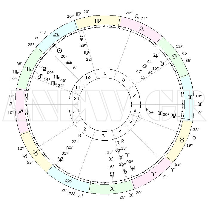 | ΘΕΣΕΙΣ ΠΛΑΝΗΤΩΝ ΑΣΤΡΟΛΟΓΙΚΟΥ ΧΑΡΤΗ ΤΗΣ ΣΤΙΓΜΗΣ ΑΥΤΗΣ | | Πλανήτης | Ζώδιο | Μοίρες | Δεκαήμ. | Σε οίκο | Απόκλιση | | Ακμές των οίκων | Ηλιος | Ζυγός | 20°11' | Τρίτο | 12 | 07 S 53 | | 1ος | 11°34' | Σκορπιός | Σελήνη | Καρκίνος | 13°53' | Δεύτερο | 9 | 27 N 22 | | 2ος | 10°45' | Τοξότης | Ερμής | Σκορπιός | 09°38' | Πρώτο | 12 | 16 S 09 | | 3ος | 13°50' | Αιγόκερως | Αφροδίτη | Παρθένος | 29°14' | Τρίτο | 11 | 01 N 41 | | 4ος | 18°51' | Υδροχόος | Αρης | Σκορπιός | 14°18' | Δεύτερο | 1 | 16 S 19 | | 5ος | 21°27' | Ιχθείς | Δίας | Καρκίνος | 23°47' | Τρίτο | 9 | 21 N 23 | | 6ος | 18°55' | Κριός | Κρόνος | Ιχθείς | 27°00'R | Τρίτο | 5 | 03 S 29 | | 7ος | 11°34' | Ταύρος | Ουρανός | Δίδυμοι | 00°54'R | Πρώτο | 7 | 20 N 08 | | 8ος | 10°45' | Δίδυμοι | Ποσειδώνας | Κριός | 00°13'R | Πρώτο | 5 | 01 S 10 | | 9ος | 13°50' | Καρκίνος | Πλούτωνας | Υδροχόος | 01°22'R | Πρώτο | 3 | 23 S 32 | | 10ος | 18°51' | Λέων | Β. Δεσμός | Ιχθείς | 16°23' | Δεύτερο | 4 | 05 S 22 | | 11ος | 21°27' | Παρθένος | Ωροσκόπος | Σκορπιός | 11°34' | Δεύτερο | | | 12ος | 18°55' | Ζυγός | Μεσουράνημα | Λέων | 18°51' | Δεύτερο | | | |