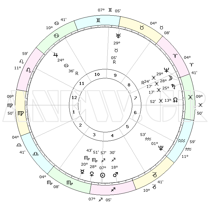 | | ΘΕΣΕΙΣ ΠΛΑΝΗΤΩΝ ΑΣΤΡΟΛΟΓΙΚΟΥ ΧΑΡΤΗ ΤΗΣ ΣΤΙΓΜΗΣ ΑΥΤΗΣ | | | | Πλανήτης | Ζώδιο | Μοίρες | Δεκαήμ. | Σε οίκο | Απόκλιση | | Ακμές των οίκων | | Ηλιος | Τοξότης | 07°55' | Πρώτο | 4 | 21 S 37 | | 1ος | 28°41' | Λέων | | Σελήνη | Ιχθείς | 27°45' | Τρίτο | 8 | 00 N 11 | | 2ος | 22°24' | Παρθένος | | Ερμής | Σκορπιός | 20°42' | Τρίτο | 3 | 15 S 28 | | 3ος | 20°57' | Ζυγός | | Αφροδίτη | Σκορπιός | 28°48' | Τρίτο | 4 | 19 S 10 | | 4ος | 23°51' | Σκορπιός | | Αρης | Τοξότης | 18°29' | Δεύτερο | 4 | 23 S 35 | | 5ος | 28°08' | Τοξότης | | Δίας | Καρκίνος | 24°36'R | Τρίτο | 11 | 21 N 21 | | 6ος | 00°11' | Υδροχόος | | Κρόνος | Ιχθείς | 25°17' | Τρίτο | 8 | 04 S 03 | | 7ος | 28°41' | Υδροχόος | | Ουρανός | Ταύρος | 29°05'R | Τρίτο | 10 | 19 N 45 | | 8ος | 22°24' | Ιχθείς | | Ποσειδώνας | Ιχθείς | 29°24'R | Τρίτο | 8 | 01 S 29 | | 9ος | 20°57' | Κριός | | Πλούτωνας | Υδροχόος | 01°53' | Πρώτο | 6 | 23 S 24 | | 10ος | 23°51' | Ταύρος | | Β. Δεσμός | Ιχθείς | 13°52' | Δεύτερο | 7 | 06 S 21 | | 11ος | 28°08' | Δίδυμοι | | Ωροσκόπος | Λέων | 28°41' | Τρίτο | | | 12ος | 00°11' | Λέων | | Μεσουράνημα | Ταύρος | 23°51' | Τρίτο | | | |