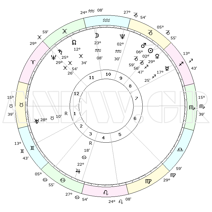 | | ΘΕΣΕΙΣ ΠΛΑΝΗΤΩΝ ΑΣΤΡΟΛΟΓΙΚΟΥ ΧΑΡΤΗ ΤΗΣ ΣΤΙΓΜΗΣ ΑΥΤΗΣ | | | | Πλανήτης | Ζώδιο | Μοίρες | Δεκαήμ. | Σε οίκο | Απόκλιση | | Ακμές των οίκων | | Ηλιος | Αιγόκερως | 02°52' | Πρώτο | 9 | 23 S 24 | | 1ος | 06°48' | Κριός | | Σελήνη | Υδροχόος | 22°14' | Τρίτο | 11 | 15 S 40 | | 2ος | 15°23' | Ταύρος | | Ερμής | Τοξότης | 17°18' | Δεύτερο | 9 | 22 S 30 | | 3ος | 11°47' | Δίδυμοι | | Αφροδίτη | Τοξότης | 29°42' | Τρίτο | 9 | 23 S 39 | | 4ος | 03°50' | Καρκίνος | | Αρης | Αιγόκερως | 06°55' | Πρώτο | 10 | 24 S 06 | | 5ος | 26°28' | Καρκίνος | | Δίας | Καρκίνος | 22°18'R | Τρίτο | 4 | 21 N 48 | | 6ος | 24°57' | Λέων | | Κρόνος | Ιχθείς | 25°54' | Τρίτο | 12 | 03 S 44 | | 7ος | 06°48' | Ζυγός | | Ουρανός | Ταύρος | 28°10'R | Τρίτο | 2 | 19 N 33 | | 8ος | 15°23' | Σκορπιός | | Ποσειδώνας | Ιχθείς | 29°26' | Τρίτο | 12 | 01 S 27 | | 9ος | 11°47' | Τοξότης | | Πλούτωνας | Υδροχόος | 02°30' | Πρώτο | 11 | 23 S 16 | | 10ος | 03°49' | Αιγόκερως | | Β. Δεσμός | Ιχθείς | 12°34' | Δεύτερο | 12 | 06 S 50 | | 11ος | 26°28' | Αιγόκερως | | Ωροσκόπος | Κριός | 06°48' | Πρώτο | | | 12ος | 24°57' | Υδροχόος | | Μεσουράνημα | Αιγόκερως | 03°49' | Πρώτο | | | |