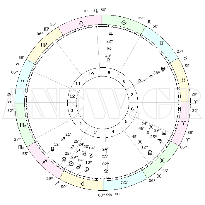 | | ΘΕΣΕΙΣ ΠΛΑΝΗΤΩΝ ΑΣΤΡΟΛΟΓΙΚΟΥ ΧΑΡΤΗ ΤΗΣ ΣΤΙΓΜΗΣ ΑΥΤΗΣ | | | | Πλανήτης | Ζώδιο | Μοίρες | Δεκαήμ. | Σε οίκο | Απόκλιση | | Ακμές των οίκων | | Ηλιος | Τοξότης | 28°54' | Τρίτο | 8 | 23 S 26 | | 1ος | 28°43' | Ταύρος | | Σελήνη | Αιγόκερως | 04°09' | Πρώτο | 8 | 28 S 00 | | 2ος | 23°47' | Δίδυμοι | | Ερμής | Τοξότης | 11°39' | Δεύτερο | 7 | 21 S 21 | | 3ος | 15°15' | Καρκίνος | | Αφροδίτη | Τοξότης | 24°48' | Τρίτο | 8 | 23 S 23 | | 4ος | 07°55' | Λέων | | Αρης | Αιγόκερως | 03°58' | Πρώτο | 8 | 24 S 11 | | 5ος | 06°10' | Παρθένος | | Δίας | Καρκίνος | 22°46'R | Τρίτο | 3 | 21 N 43 | | 6ος | 14°24' | Ζυγός | | Κρόνος | Ιχθείς | 25°44' | Τρίτο | 11 | 03 S 49 | | 7ος | 28°43' | Σκορπιός | | Ουρανός | Ταύρος | 28°18'R | Τρίτο | 12 | 19 N 35 | | 8ος | 23°47' | Τοξότης | | Ποσειδώνας | Ιχθείς | 29°24' | Τρίτο | 11 | 01 S 28 | | 9ος | 15°15' | Αιγόκερως | | Πλούτωνας | Υδροχόος | 02°23' | Πρώτο | 9 | 23 S 17 | | 10ος | 07°55' | Υδροχόος | | Β. Δεσμός | Ιχθείς | 12°47' | Δεύτερο | 11 | 06 S 46 | | 11ος | 06°10' | Ιχθείς | | Ωροσκόπος | Ταύρος | 28°43' | Τρίτο | | | 12ος | 14°24' | Κριός | | Μεσουράνημα | Υδροχόος | 07°55' | Πρώτο | | | |