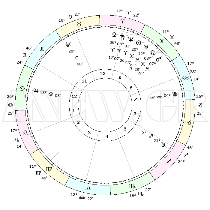 | | ΘΕΣΕΙΣ ΠΛΑΝΗΤΩΝ ΑΣΤΡΟΛΟΓΙΚΟΥ ΧΑΡΤΗ ΤΗΣ ΣΤΙΓΜΗΣ ΑΥΤΗΣ | | | | Πλανήτης | Ζώδιο | Μοίρες | Δεκαήμ. | Σε οίκο | Απόκλιση | | Ακμές των οίκων | | Ηλιος | Ιχθείς | 20°52' | Τρίτο | 10 | 03 S 37 | | 1ος | 08°58' | Καρκίνος | | Σελήνη | Τοξότης | 21°16' | Τρίτο | 6 | 28 S 17 | | 2ος | 29°25' | Καρκίνος | | Ερμής | Ιχθείς | 12°58'R | Δεύτερο | 9 | 03 S 46 | | 3ος | 21°56' | Λέων | | Αφροδίτη | Κριός | 06°13' | Πρώτο | 10 | 01 N 25 | | 4ος | 19°44' | Παρθένος | | Αρης | Ιχθείς | 06°59' | Πρώτο | 9 | 09 S 58 | | 5ος | 24°54' | Ζυγός | | Δίας | Καρκίνος | 15°05' | Δεύτερο | 1 | 22 N 56 | | 6ος | 03°59' | Τοξότης | | Κρόνος | Κριός | 03°06' | Πρώτο | 10 | 00 S 43 | | 7ος | 08°58' | Αιγόκερως | | Ουρανός | Ταύρος | 28°00' | Τρίτο | 11 | 19 N 32 | | 8ος | 29°25' | Αιγόκερως | | Ποσειδώνας | Κριός | 01°26' | Πρώτο | 10 | 00 S 38 | | 9ος | 21°56' | Υδροχόος | | Πλούτωνας | Υδροχόος | 04°48' | Πρώτο | 8 | 22 S 50 | | 10ος | 19°44' | Ιχθείς | | Β. Δεσμός | Ιχθείς | 08°30' | Πρώτο | 9 | 08 S 23 | | 11ος | 24°54' | Κριός | | Ωροσκόπος | Καρκίνος | 08°58' | Πρώτο | | | 12ος | 03°59' | Δίδυμοι | | Μεσουράνημα | Ιχθείς | 19°44' | Δεύτερο | | | |