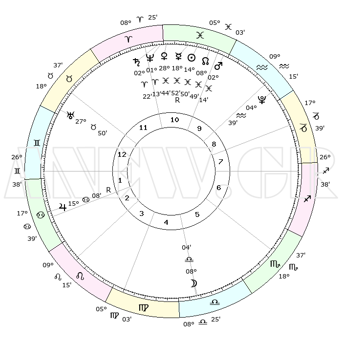 | | ΘΕΣΕΙΣ ΠΛΑΝΗΤΩΝ ΑΣΤΡΟΛΟΓΙΚΟΥ ΧΑΡΤΗ ΤΗΣ ΣΤΙΓΜΗΣ ΑΥΤΗΣ | | | | Πλανήτης | Ζώδιο | Μοίρες | Δεκαήμ. | Σε οίκο | Απόκλιση | | Ακμές των οίκων | | Ηλιος | Ιχθείς | 14°46' | Δεύτερο | 11 | 06 S 00 | | 1ος | 28°41' | Ταύρος | | Σελήνη | Ζυγός | 07°08' | Πρώτο | 5 | 05 S 07 | | 2ος | 23°45' | Δίδυμοι | | Ερμής | Ιχθείς | 18°56'R | Δεύτερο | 11 | 00 S 59 | | 3ος | 15°14' | Καρκίνος | | Αφροδίτη | Ιχθείς | 28°38' | Τρίτο | 11 | 01 S 43 | | 4ος | 07°54' | Λέων | | Αρης | Ιχθείς | 02°11' | Πρώτο | 10 | 11 S 43 | | 5ος | 06°08' | Παρθένος | | Δίας | Καρκίνος | 15°08'R | Δεύτερο | 2 | 22 N 55 | | 6ος | 14°22' | Ζυγός | | Κρόνος | Κριός | 02°22' | Πρώτο | 11 | 01 S 01 | | 7ος | 28°41' | Σκορπιός | | Ουρανός | Ταύρος | 27°50' | Τρίτο | 12 | 19 N 30 | | 8ος | 23°45' | Τοξότης | | Ποσειδώνας | Κριός | 01°12' | Πρώτο | 11 | 00 S 43 | | 9ος | 15°14' | Αιγόκερως | | Πλούτωνας | Υδροχόος | 04°39' | Πρώτο | 9 | 22 S 51 | | 10ος | 07°54' | Υδροχόος | | Β. Δεσμός | Ιχθείς | 08°49' | Πρώτο | 11 | 08 S 16 | | 11ος | 06°08' | Ιχθείς | | Ωροσκόπος | Ταύρος | 28°41' | Τρίτο | | | 12ος | 14°22' | Κριός | | Μεσουράνημα | Υδροχόος | 07°54' | Πρώτο | | | |